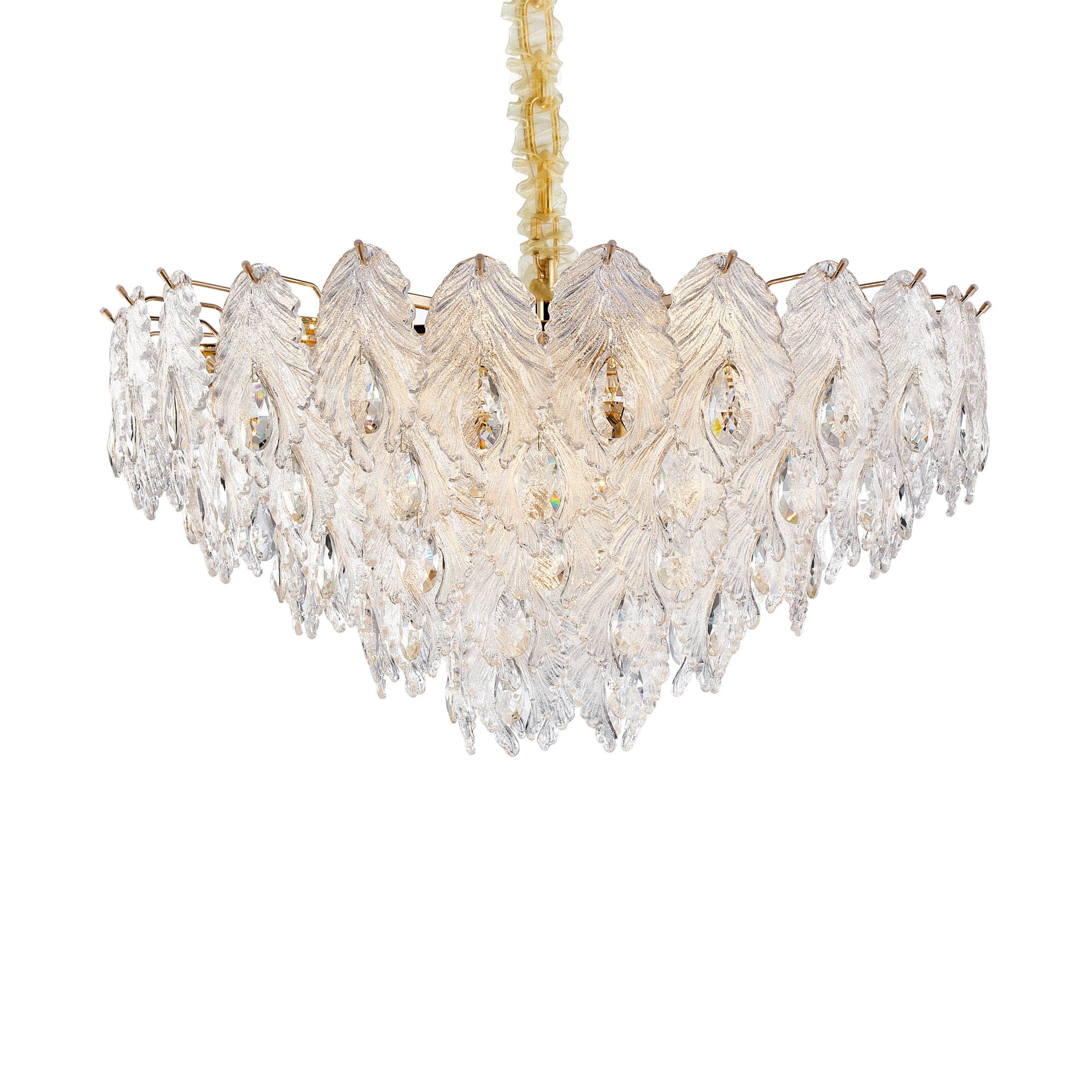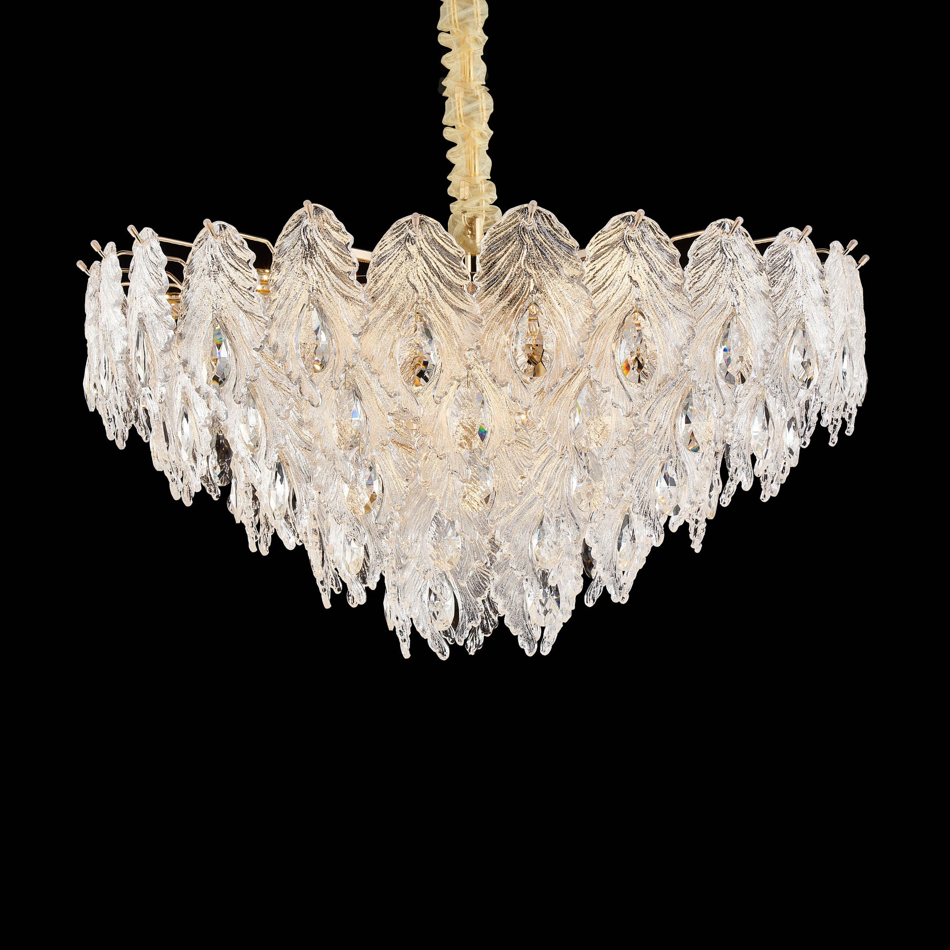 A vision of sculptural radiance, the Orlisse 18-Light Chandelier elevates any space with its layered elegance and couture detailing. Dozens of intricately textured, feather-like glass elements cascade from a lustrous gold frame, each one cradling a hand-cut almond-shaped crystal. The dual textures play with light—diffusing it softly while simultaneously dazzling with a golden sparkle. Designed to command attention in grand interiors, this chandelier is a true work of luminous art.