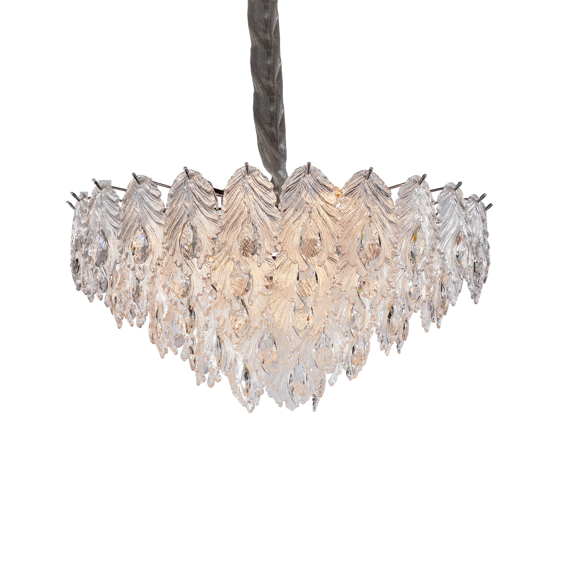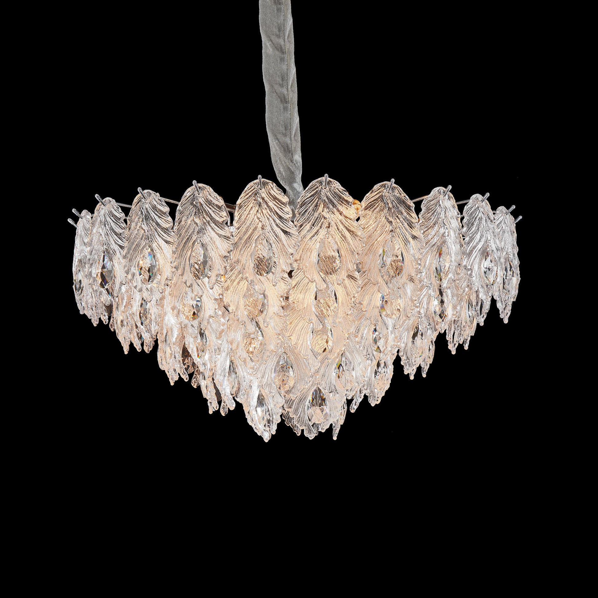 - Glass Feathers with Almond-Cut Crystal Drops: Every glass element is etched with delicate feather-like striations and inset with a brilliant crystal, reflecting light with refined opulence.