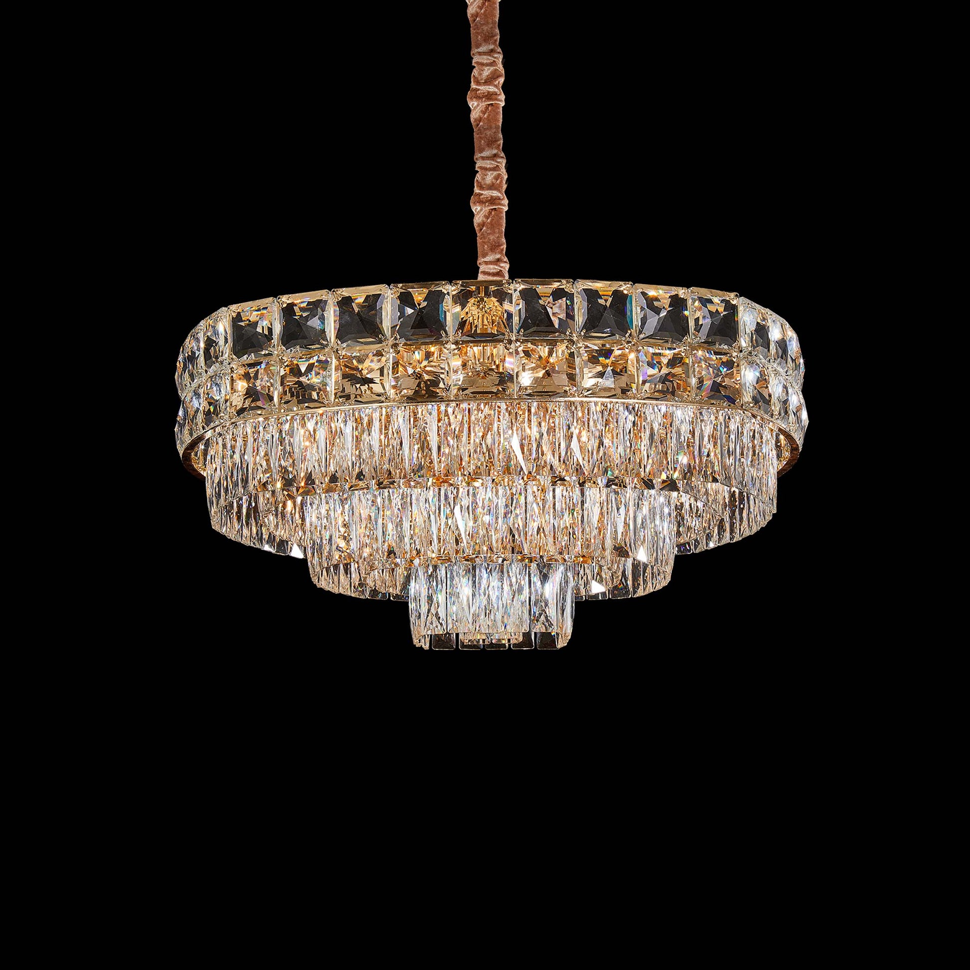 - Velvet-Wrapped Suspension Chain: The chandelier is suspended from a softly ruched velvet-wrapped chain, adding couture sophistication to the final presentation.