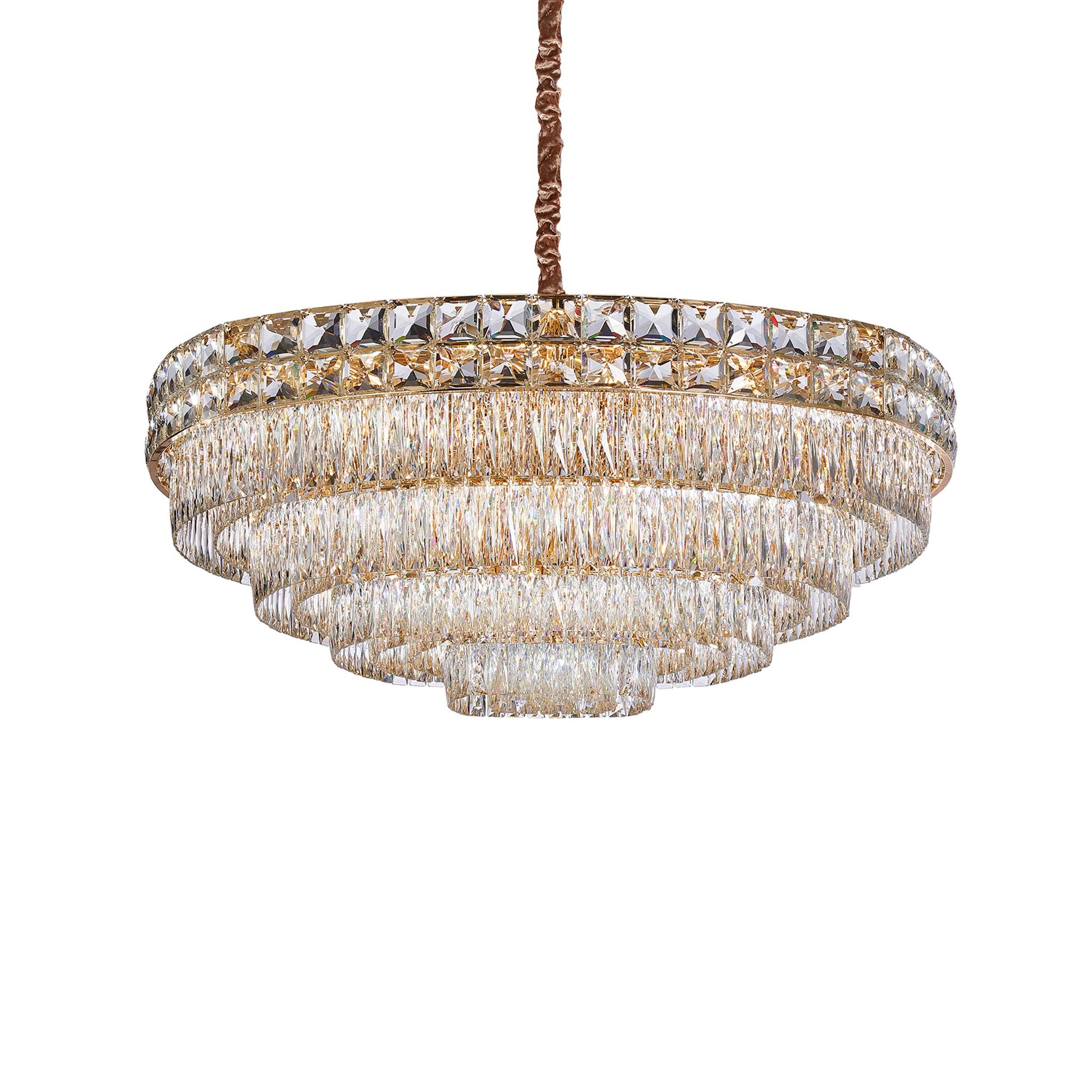 - Faceted Crystal Crown Frame: Encircling the top, square-cut crystals are inset into a radiant gold band, enhancing the chandelier’s regal silhouette with architectural precision.
