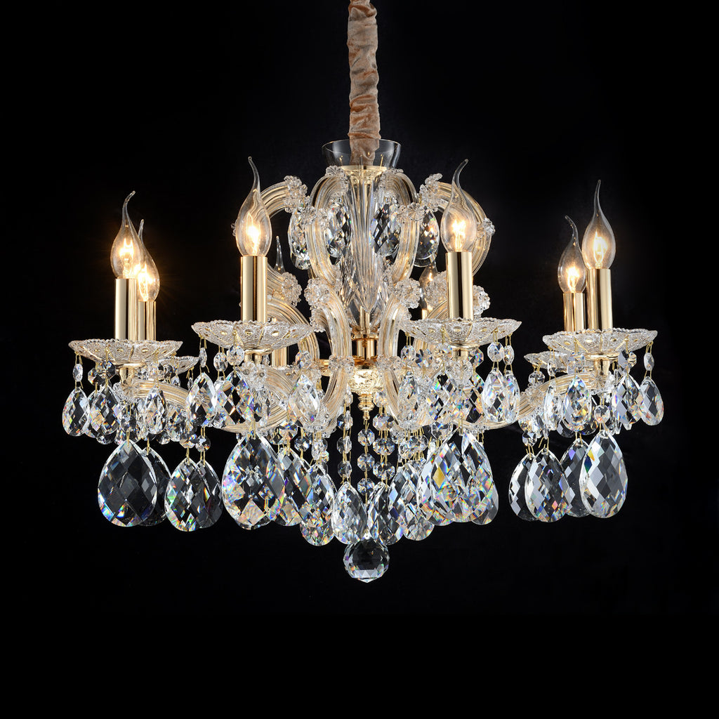 Portola II is designed with clear glass and gold accents that complement its brilliant candle glow. Shaped with curling glass arms and cut crystal drops, this chandelier offers a timeless style you won’t ever let go.