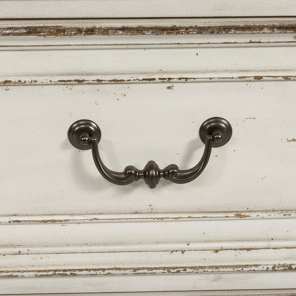 This unique 2 drawer night stand is the perfect way to accent your room with an effortless blend of European Traditional design. Weathered top paired with the antique finish creates a truly unique look. Softness is added to the design with canted corners and rounded pilasters, accompanied by bead molding on each drawer front. The night stand features a fully stained interior drawer, felt lined top drawer, and bottom case dust proofing that is accented by custom antique pewter bail and knob hardware.