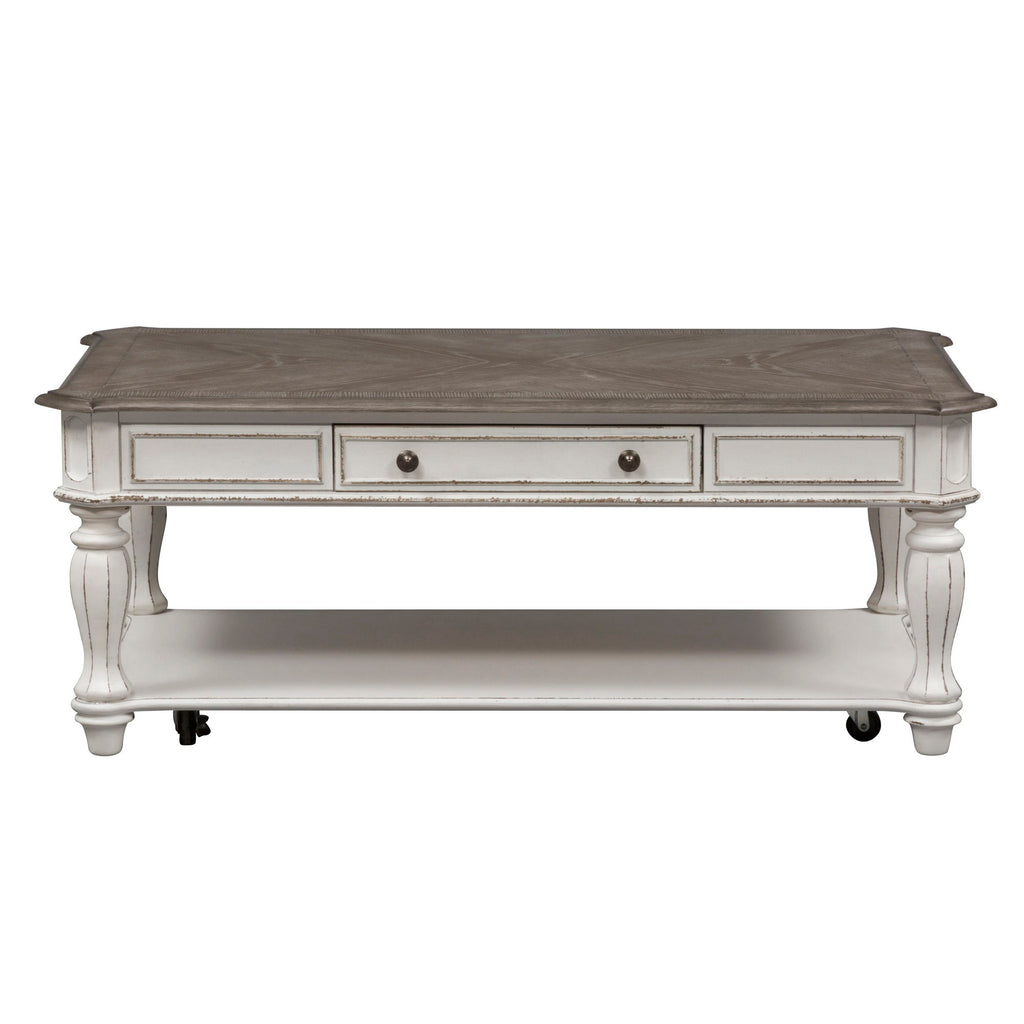 The perfect blend of European design with the Magnolia Manor. Crafted of poplar solids with oak and birch veneers, this piece features a weathered top, one fully stained interior drawer full extension drawer in each table, fancy face top, wood framed drawer fronts, bead molding, canted corners, faceted turned legs, cocktail offers casters that make rearranging effortless, antique pewter knob hardware and a bottom shelf for additional storage. Warm finishes and artistic distressing along with grand scale create a piece to be passed to generations. Kit consists of one cocktail table and two end tables.
