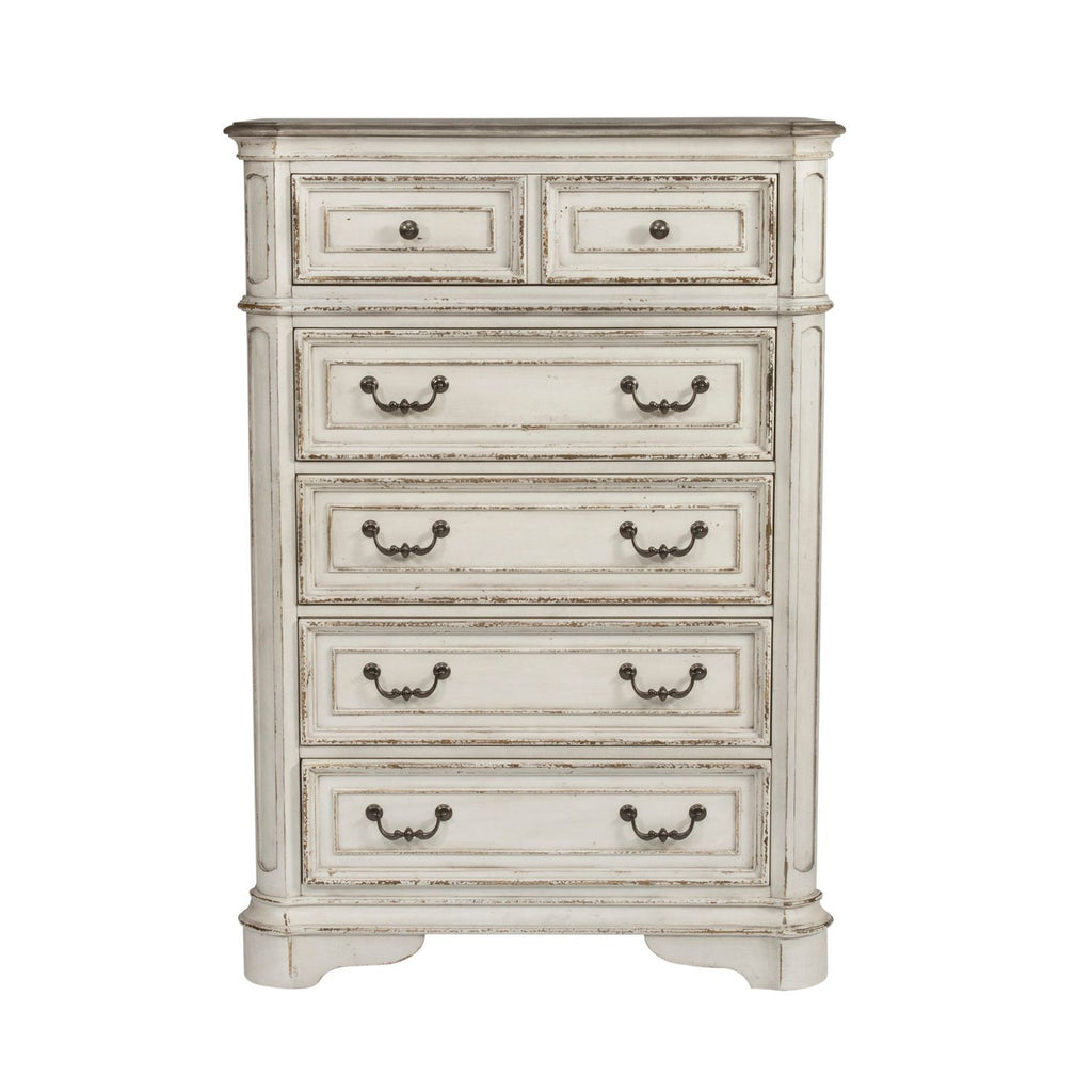 Opt for an elegant display. A refined yet relaxed feel describes the Magnolia Manor upholstered bed, dresser, and mirror. Crafted of poplar solids with white oak and birch veneers, this kit features an antique white finish with heavy artistic chipping and weathered brown with whitewash tops. The bed is upholstered in tufted chenille, laced with tone’s of white, tan and brown threading. The arched crowning and dog bone accents on each corner effortlessly add both definition and character, completing your look. The dresser and mirror duo are the perfect way to accent your room. Weathered brown whitewash tops paired with the antique white finish creates a truly unique look. Softness is added to the design with canted corners and rounded pilasters, accompanied by bead molding on each drawer front. Warm antique finishes and artistic distressing along with grand scale creates a group to be passed to generations.