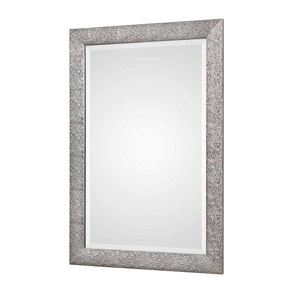 Solid Wood Frame Featuring An Embossed Wavy Texture, Finished In A Metallic Silver With A Light Gray Wash. Mirror Features A Generous 1 1/4" Bevel And May Be Hung Horizontal Or Vertical.