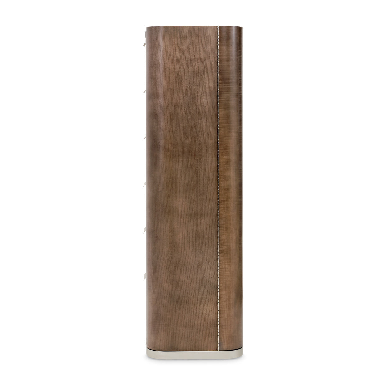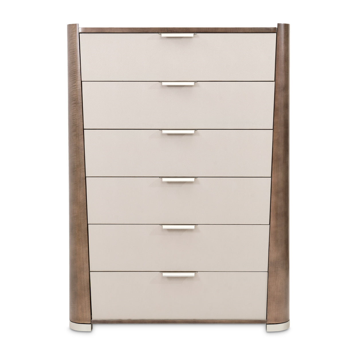 - Chest features a Slate frame with contrasting drawer fronts in a frost gray faux shagreen
