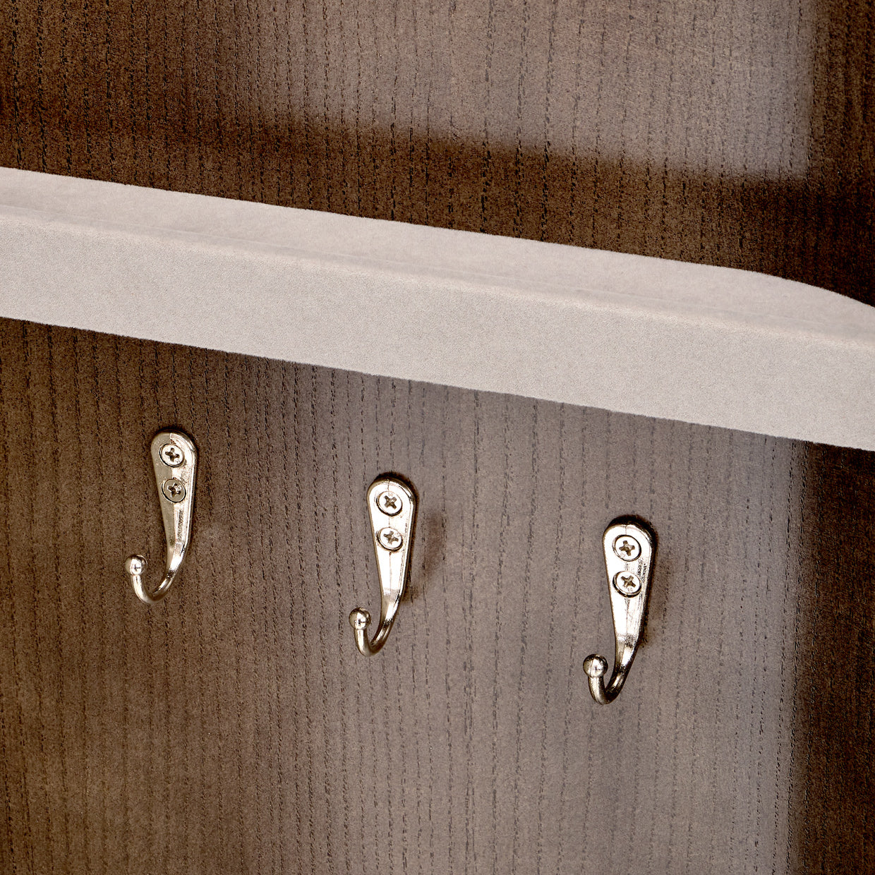- Rounded sides each include a hidden cabinet with tie hooks for additional storage options