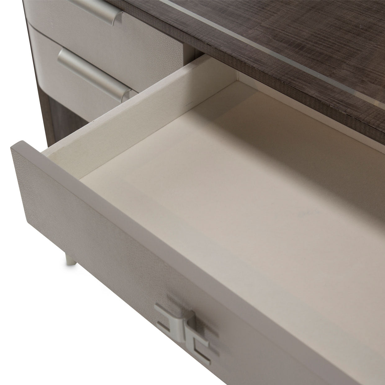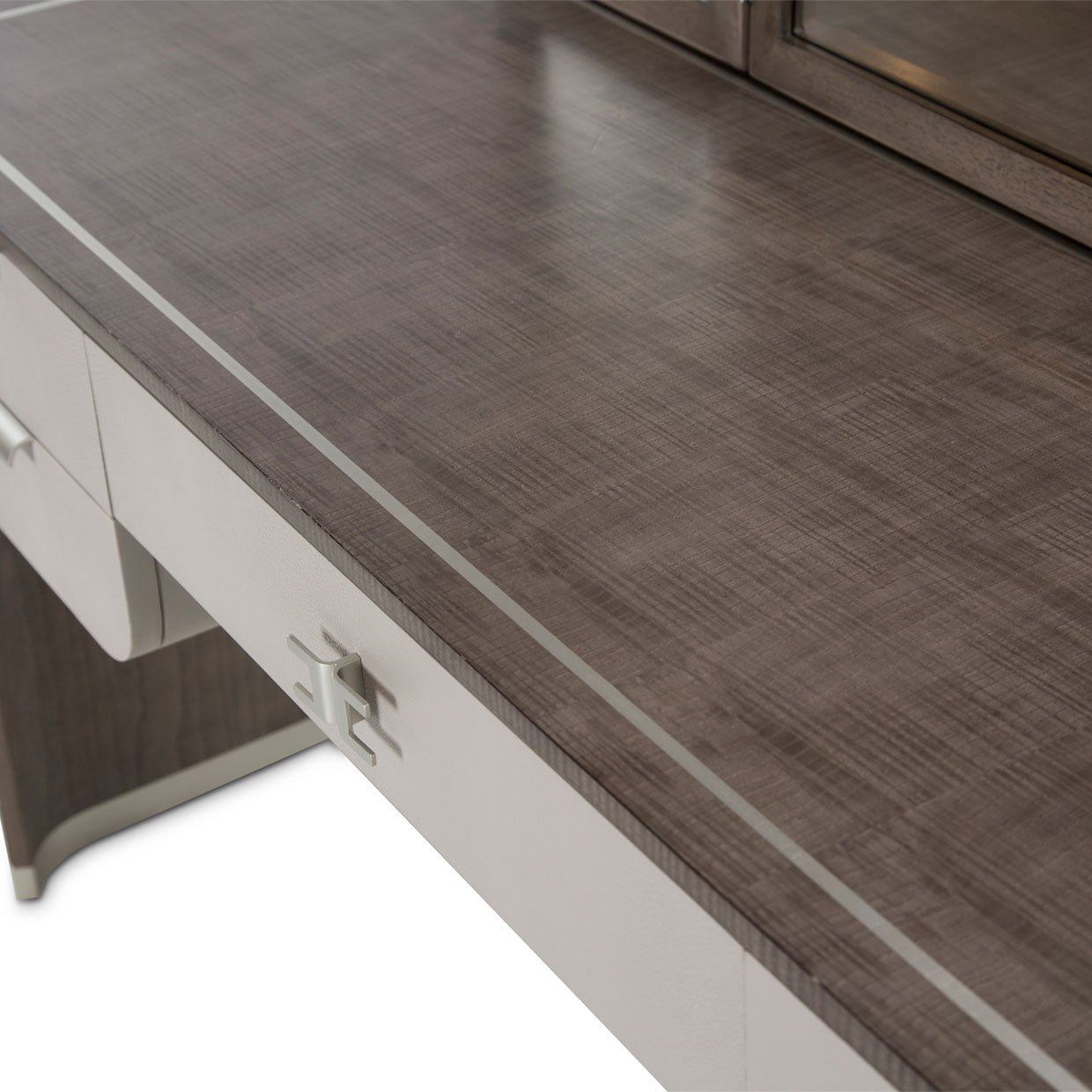- Vanity features a frame in Slate with contrasting faux shagreen drawer fronts in a frost gray