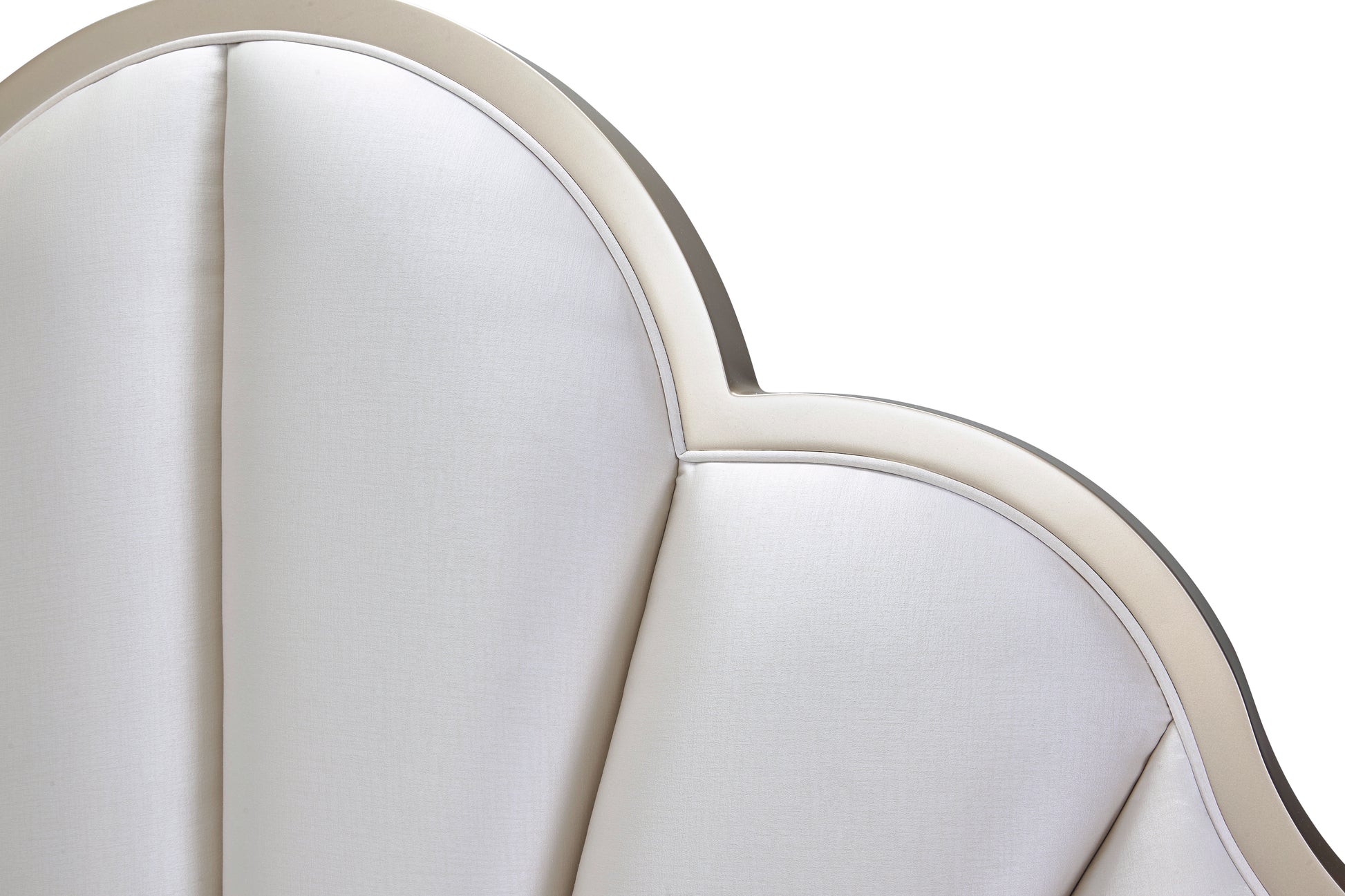 - Headboard, side panels, and footboard are upholstered in faux silk in a Porcelain color