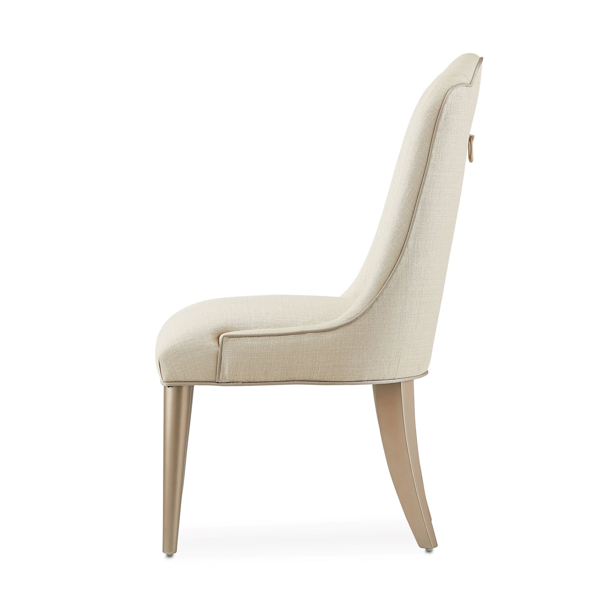 Make your dining experience as elegant as possible! The Malibu Crest Side Chair features the shimmering texture of frosted linen fabric, the soft sheen of Chardonnay finished legs and a delicate ring accent on the chair back. Your modern dining space is ready for this glamorous design!