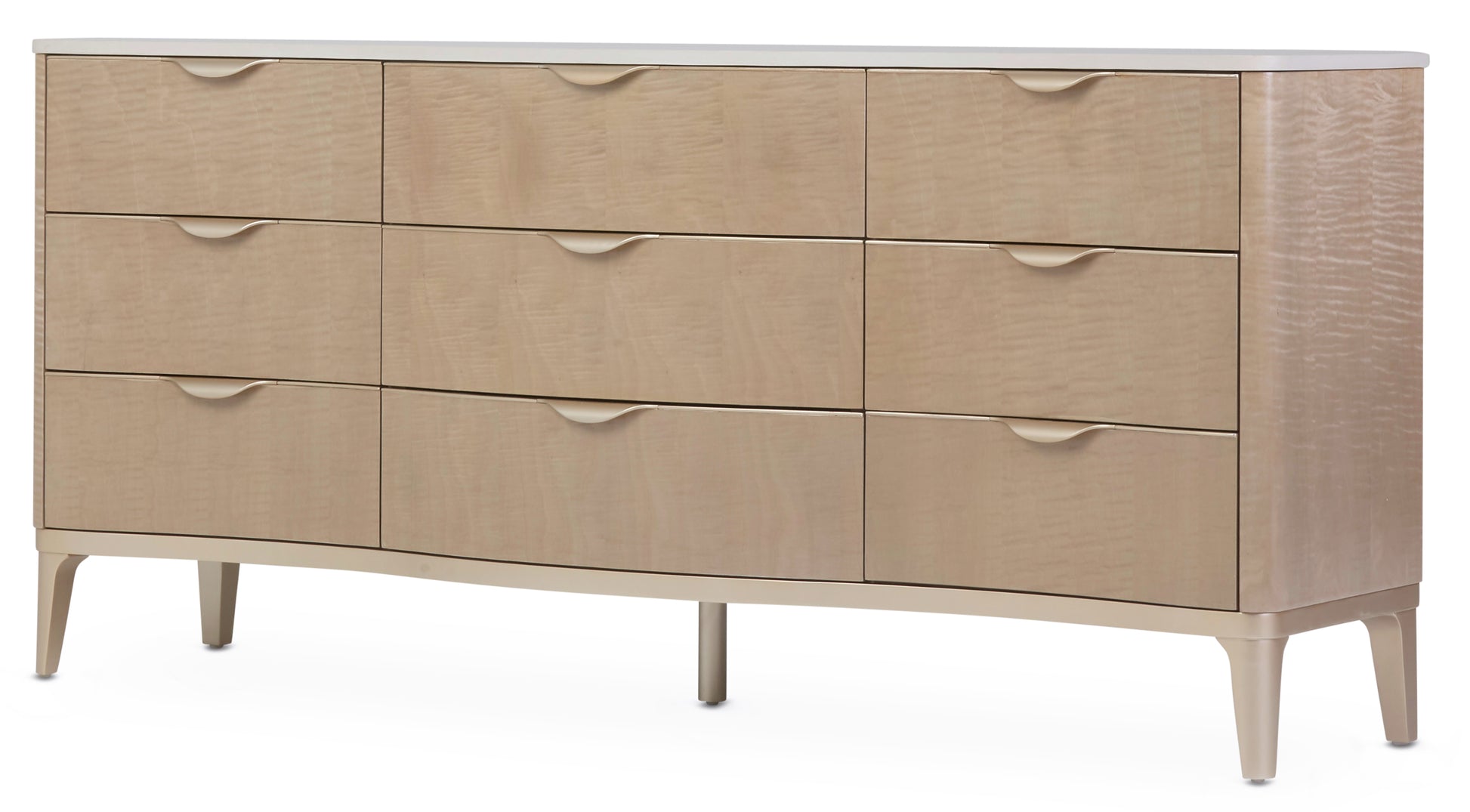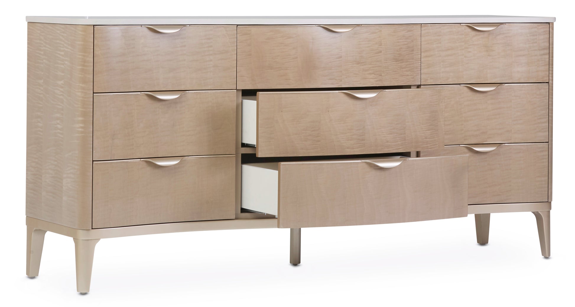 - Nine velvet lined drawers with self-closing glides and curved waterfall pulls