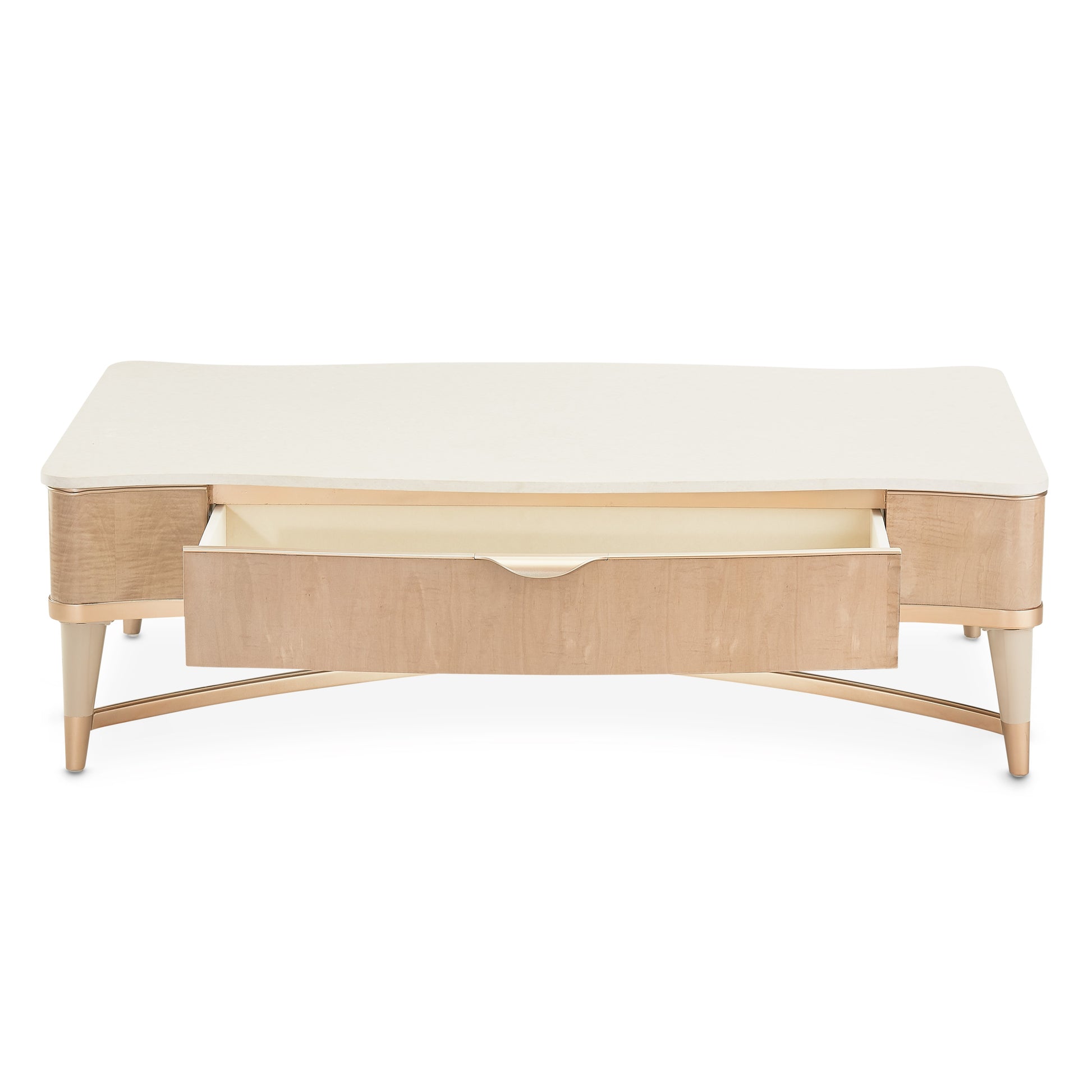 - Cocktail table features a maple veneer frame in a Blush finish with Chardonnay accents