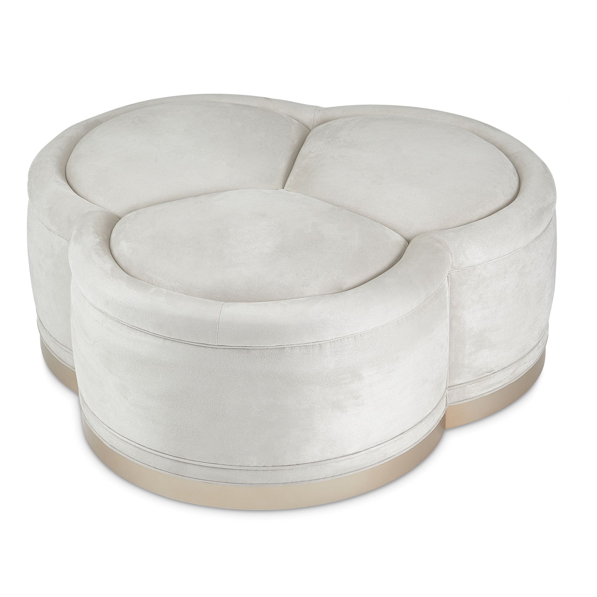 The Malibu Crest Ottoman is a versatile, elegant accent with faux suede fabric in a lovely Doeskin color. This soft, clover-shaped piece is firm enough to double as a cocktail table while remaining comfortable to sit or prop your feet on. You'll love the glamorous Chardonnay base finish and how this design will enhance your luxury space.