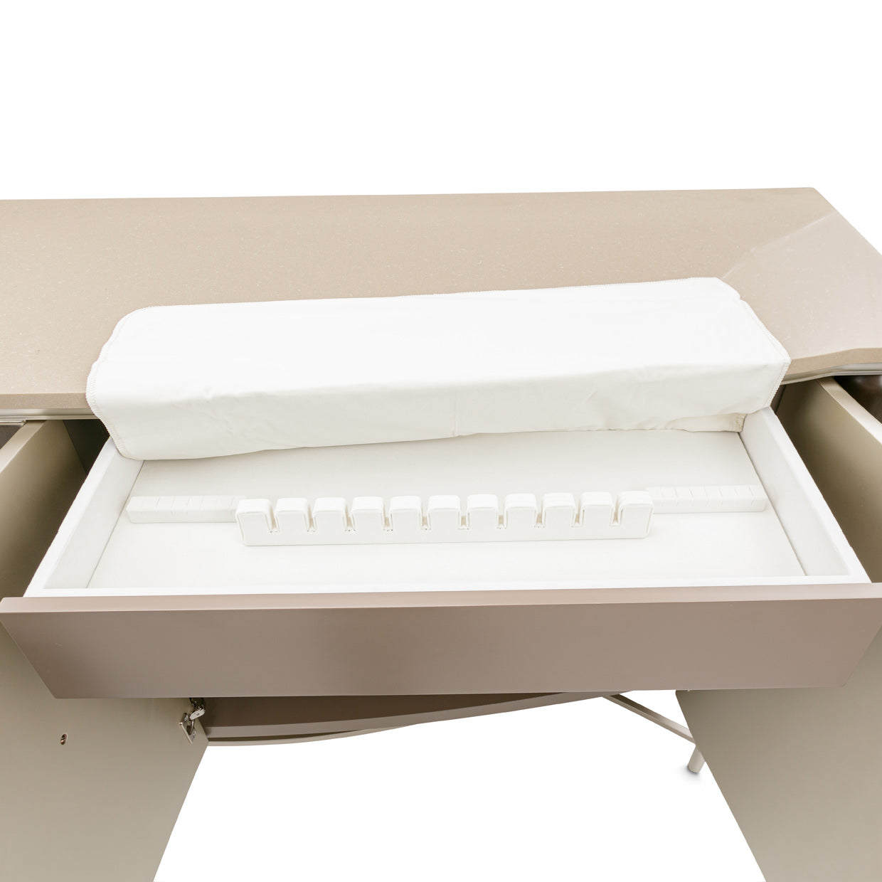 - Legs feature a tapered design with accents in a Chardonnay finish