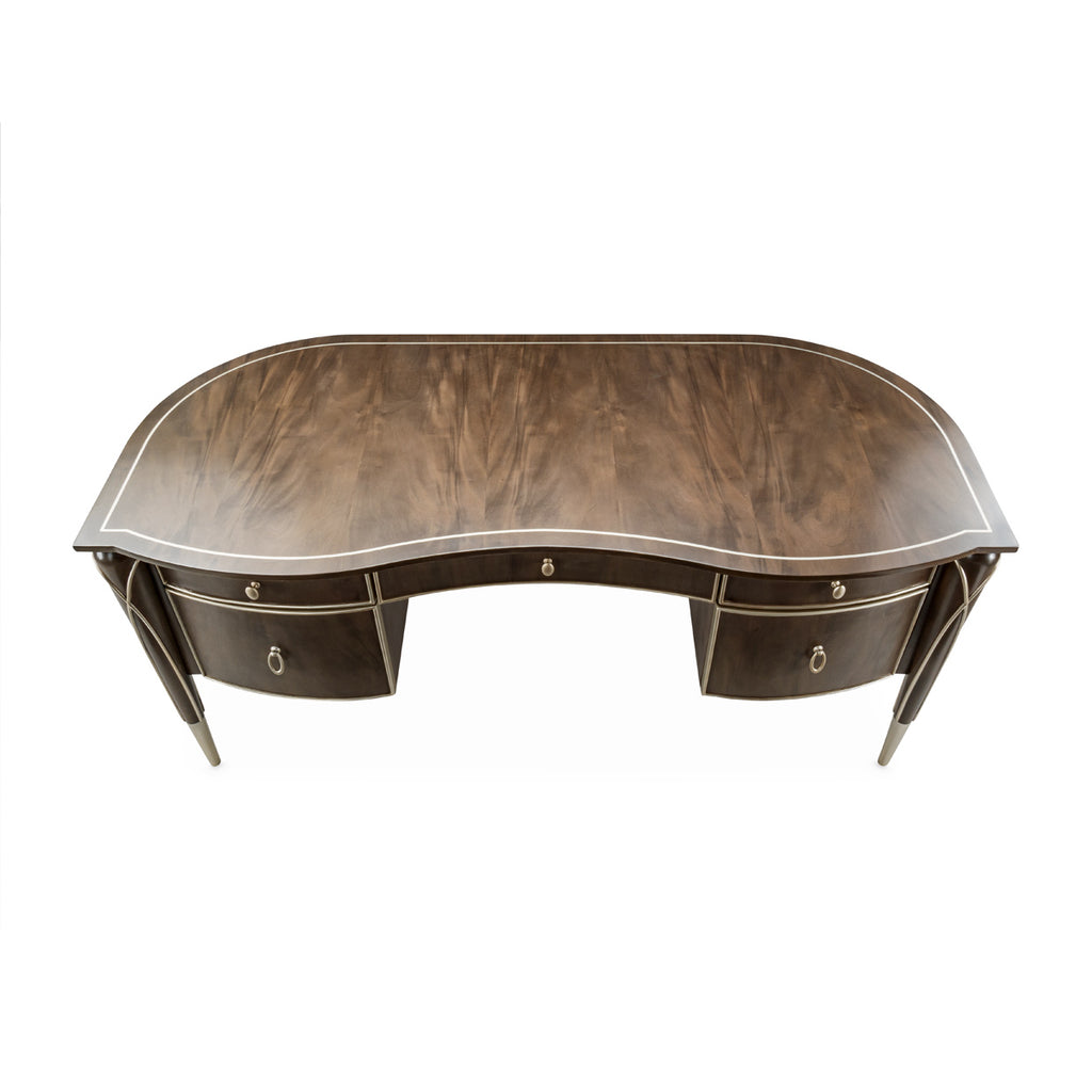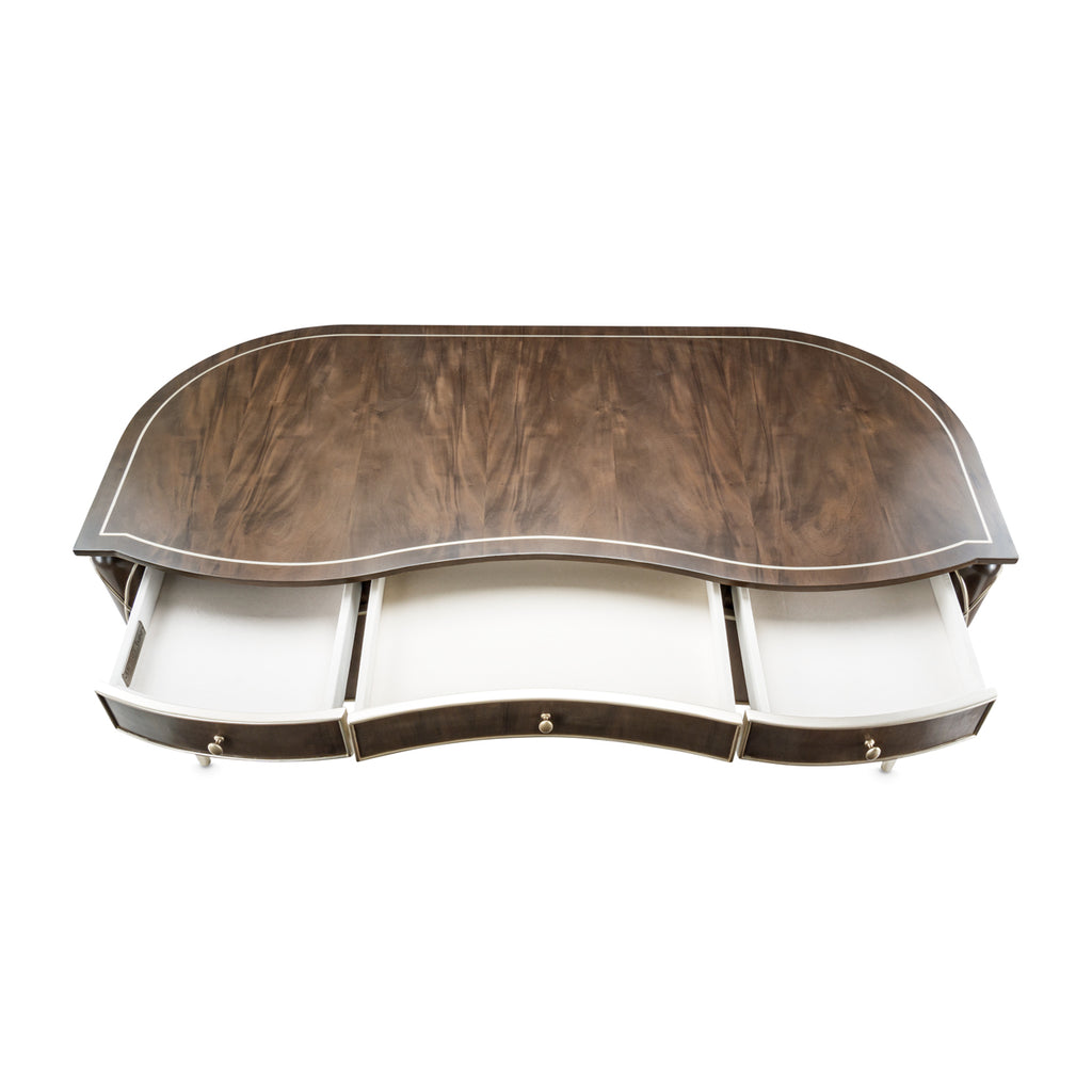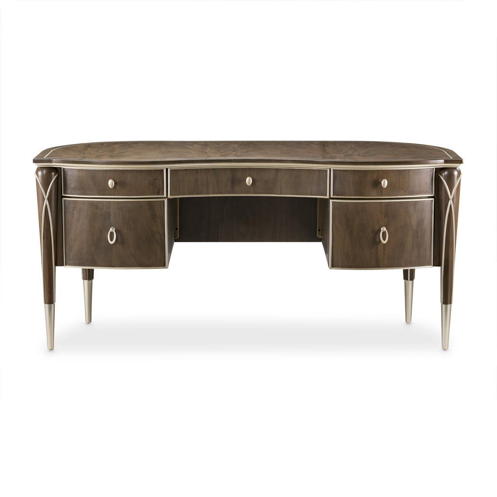 The Villa Cherie Desk seamlessly blends function with style. Velvet lined drawers and a spacious tabletop offer practicality while chic champagne accents, delicate hoop pulls, and Swirl Mahogany veneers make this piece stand out in a crowd.