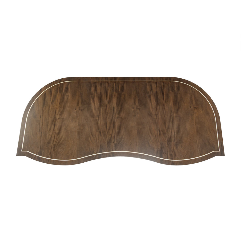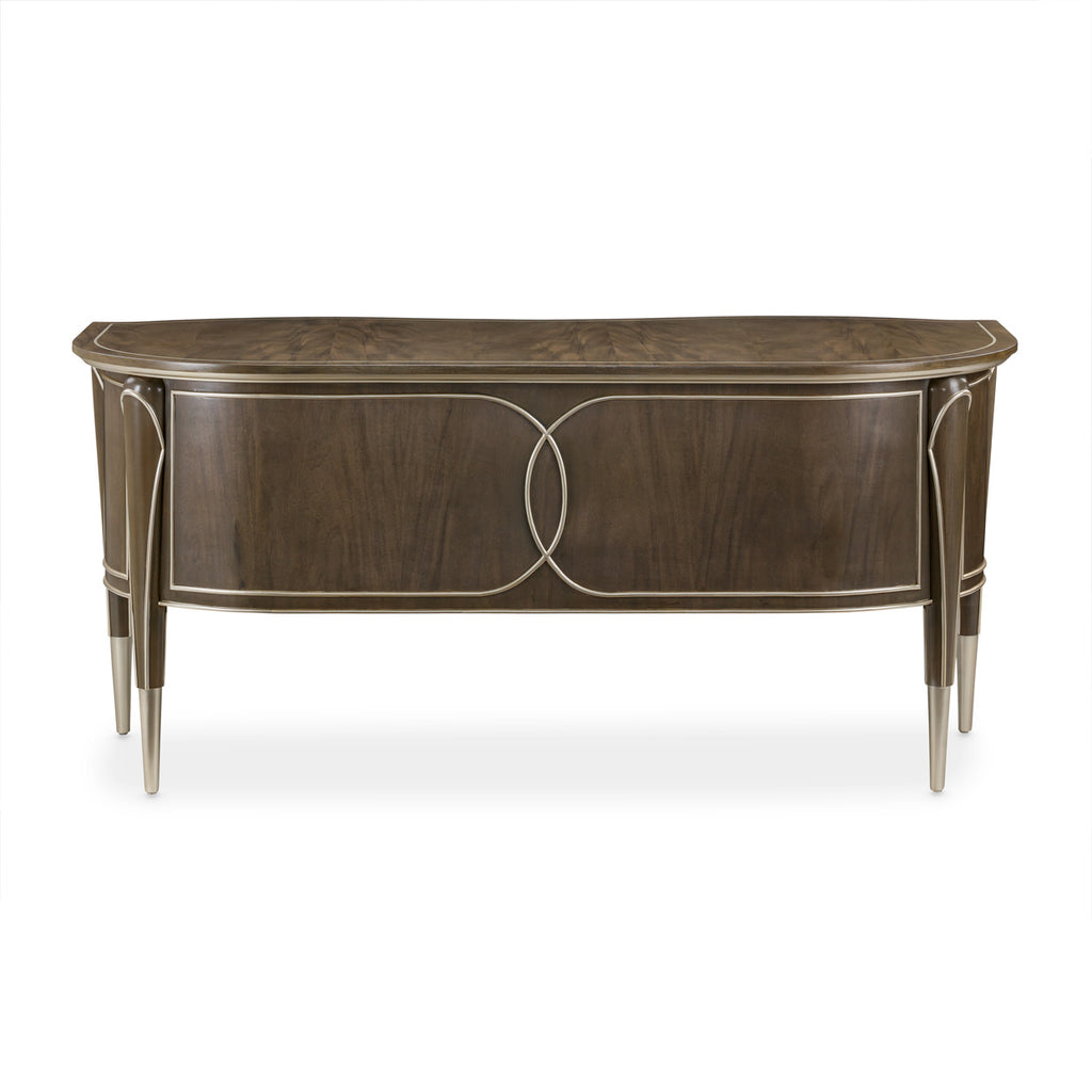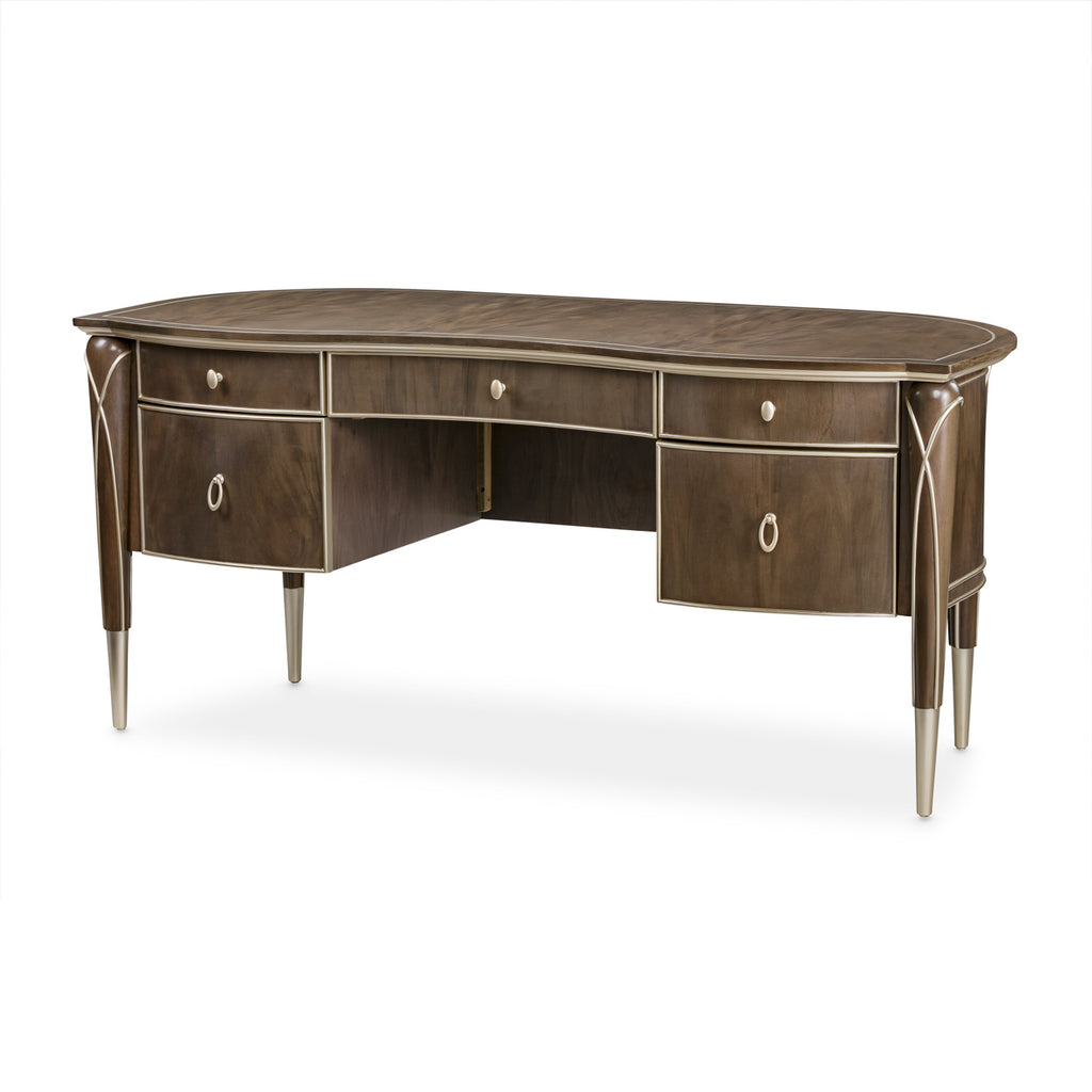The Villa Cherie Desk seamlessly blends function with style. Velvet lined drawers and a spacious tabletop offer practicality while chic champagne accents, delicate hoop pulls, and Swirl Mahogany veneers make this piece stand out in a crowd.