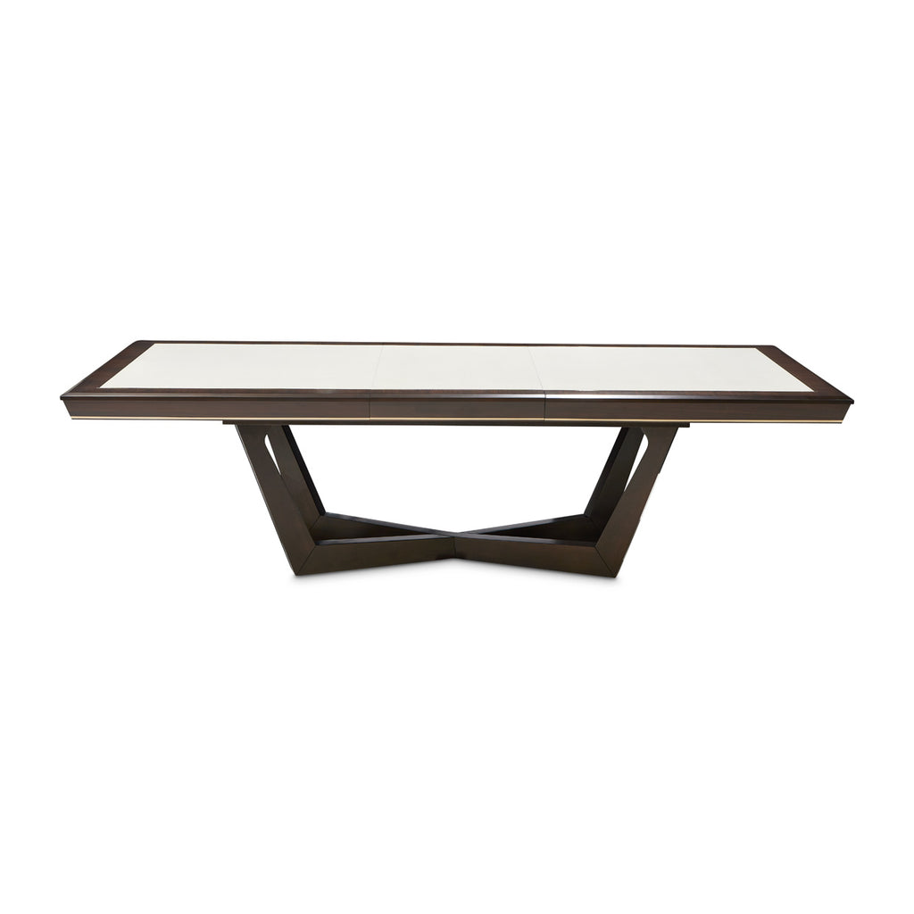 Gather around the Belmont Place Dining Table, where every meal becomes a lavish affair. The delicate dance of the tranquil white anigre veneer inlay with the profound depth of the espresso eucalyptus veneer evokes an ambiance of timeless elegance. The table’s apron, kissed by the soft gleam of Japan gold plated alloy, and the artful sleek centered base, stands as a testament to unparalleled craftsmanship.