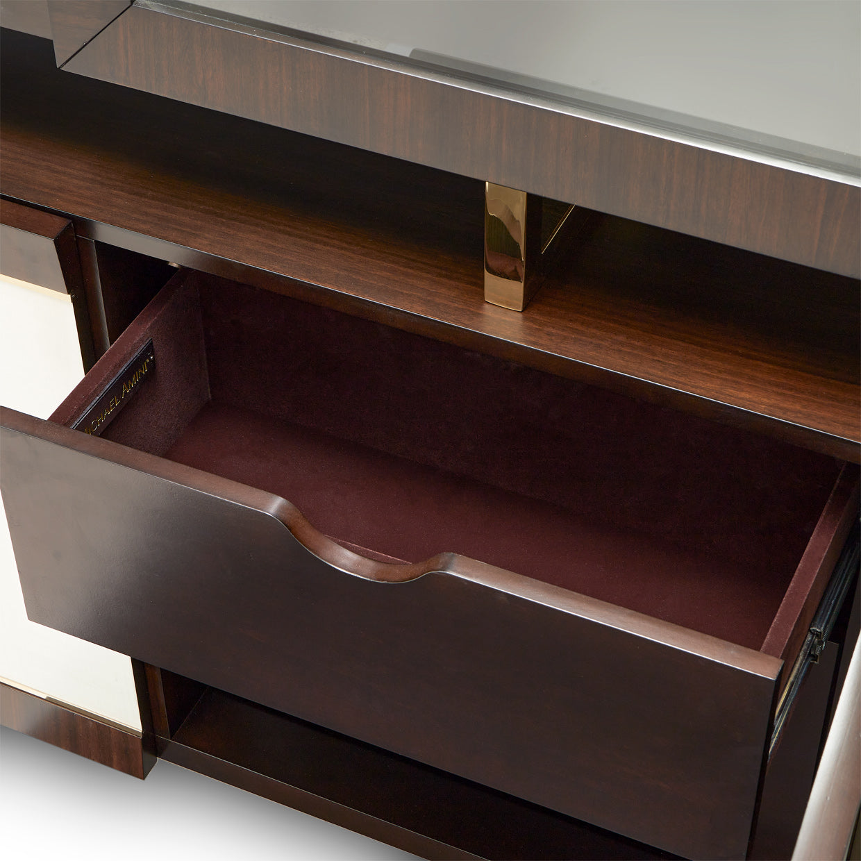 - Contrasting White Anigre Doors: The lower cabinet doors are inlaid with lustrous white anigre veneer, elegantly framed in rich espresso and accented with a gold trim that highlights the piece’s bold contrast and refined geometry.