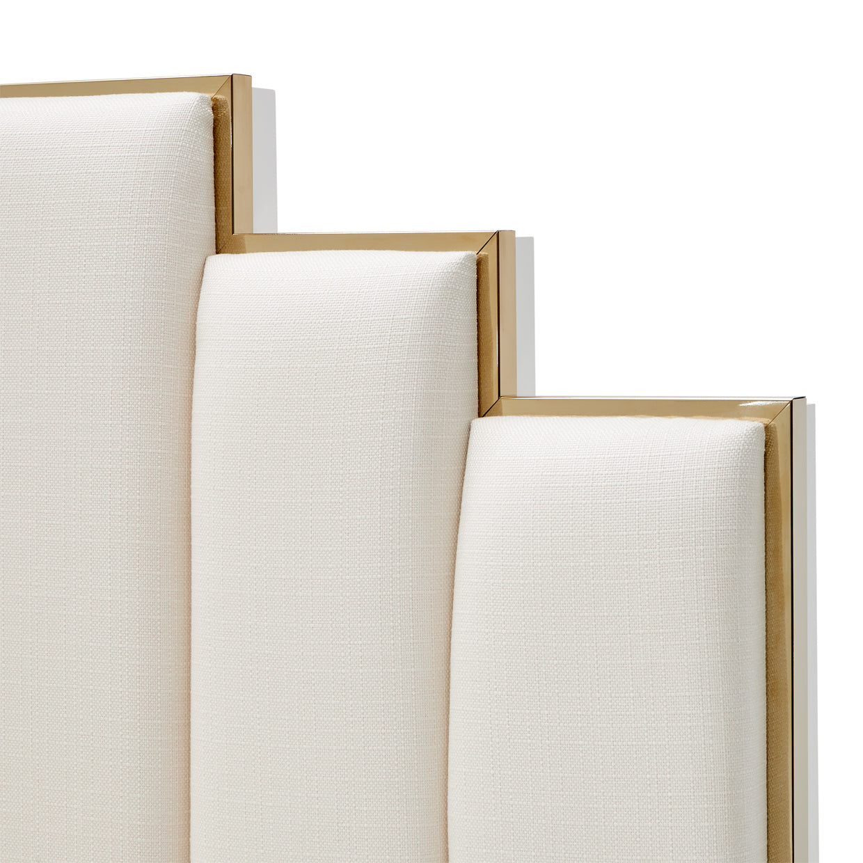 Bask in Palm Gate's bed, where luxury and comfort intertwine. Its unique headboard, with gold alloy framing, chic channeled upholstery, and a glossy acrylic bed frame and golden legs, create a timeless sleep sanctuary. Beyond its beauty lies convenience – USB 2.0 ports are on each side of the bed.