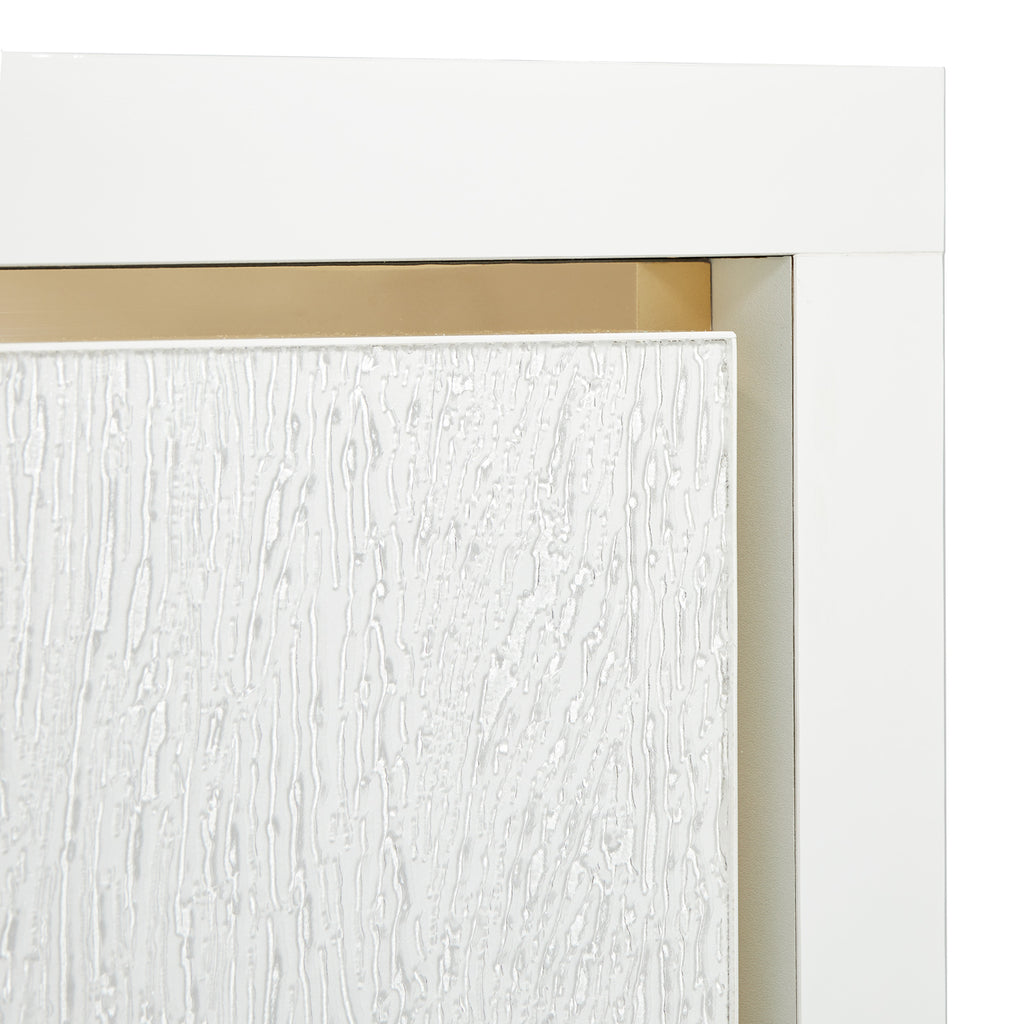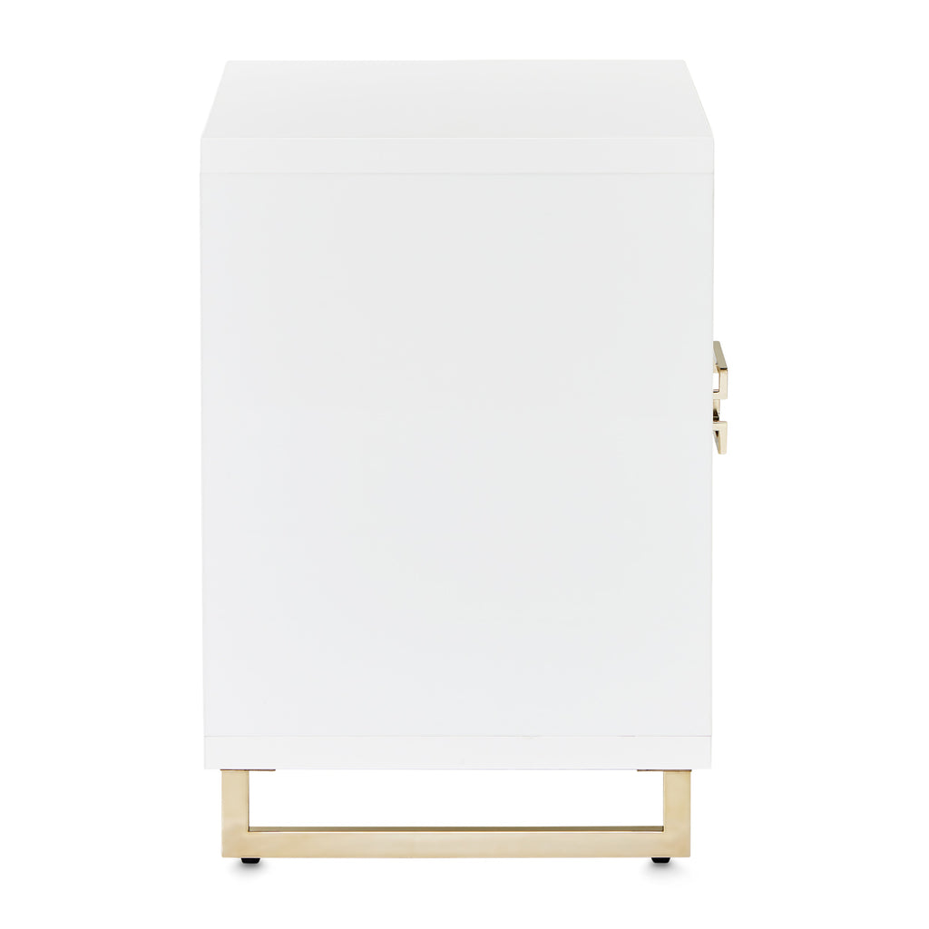 Our Palm Gate Nightstand blends functionality and elegance. With gold accents, thoughtfully placed handles, and two velvet-lined drawers housed within a pristine acrylic body, it's a stylish addition to any bedside.