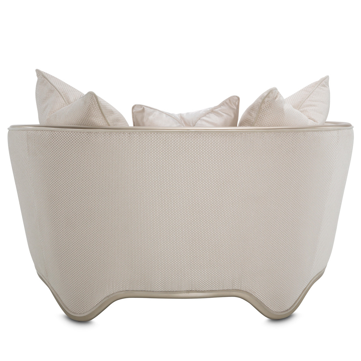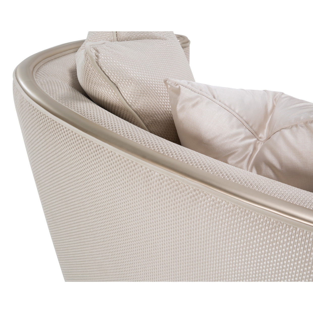 - Chair cushion and body are upholstered in a champagne fabric the emulates raw woven silk