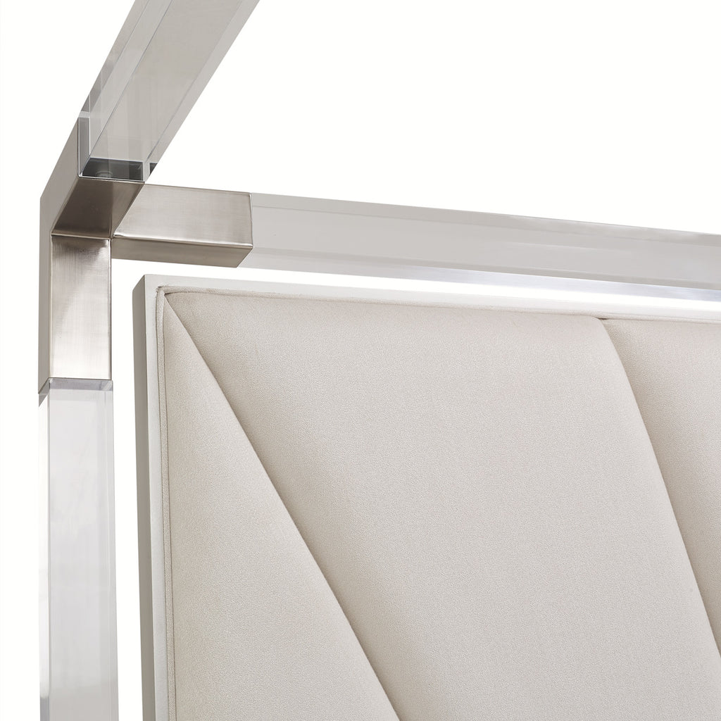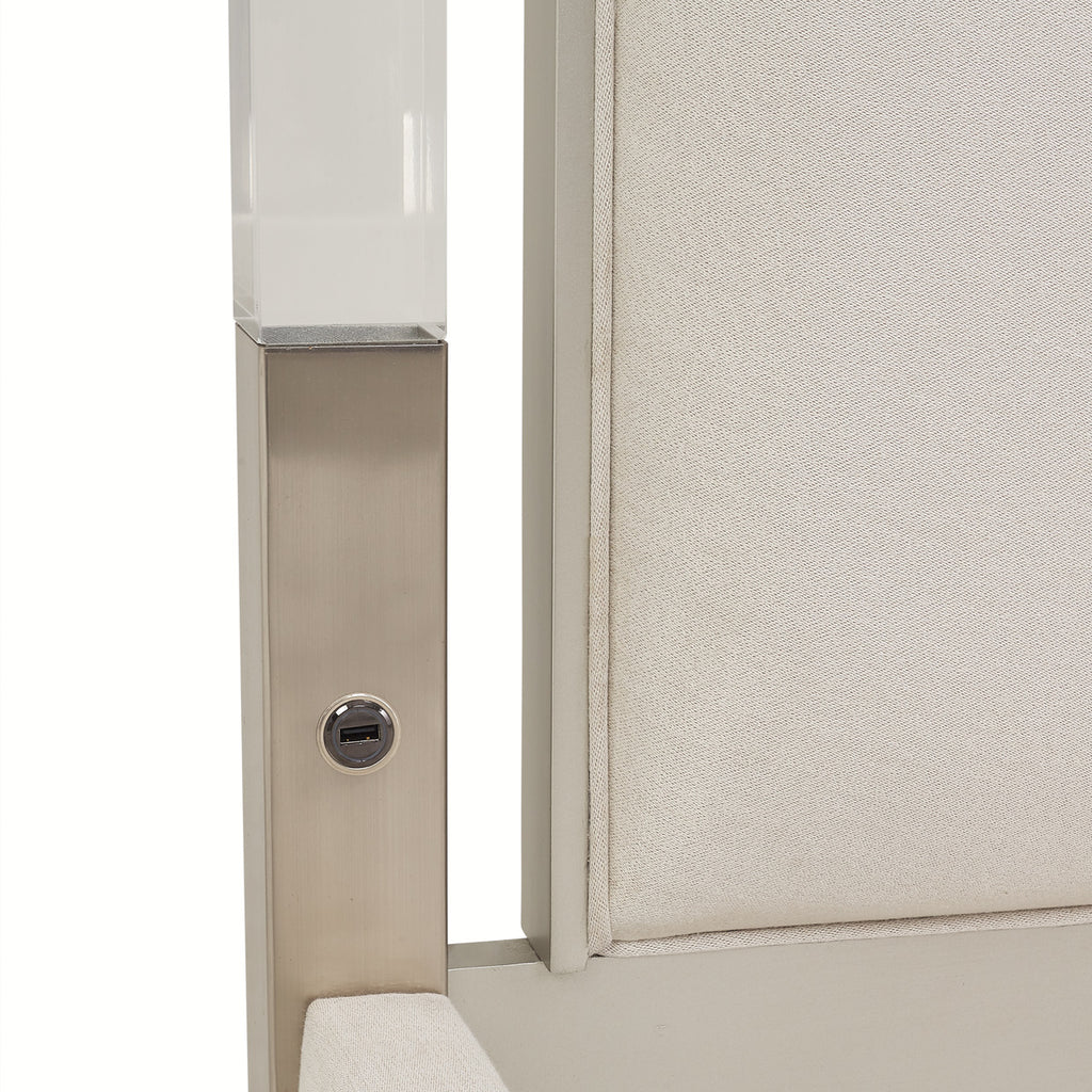 Customize your bedroom with the fresh design of the Penthouse Tufted Canopy Bed. Headboard and frame are upholstered in a shimmery woven fabric beautifully accented by the acrylic and stainless steel bordering the stately headboard and canopy frame. The added convenience of USB ports on both sides will keep you connected while you rest. Your home design options are endless.
