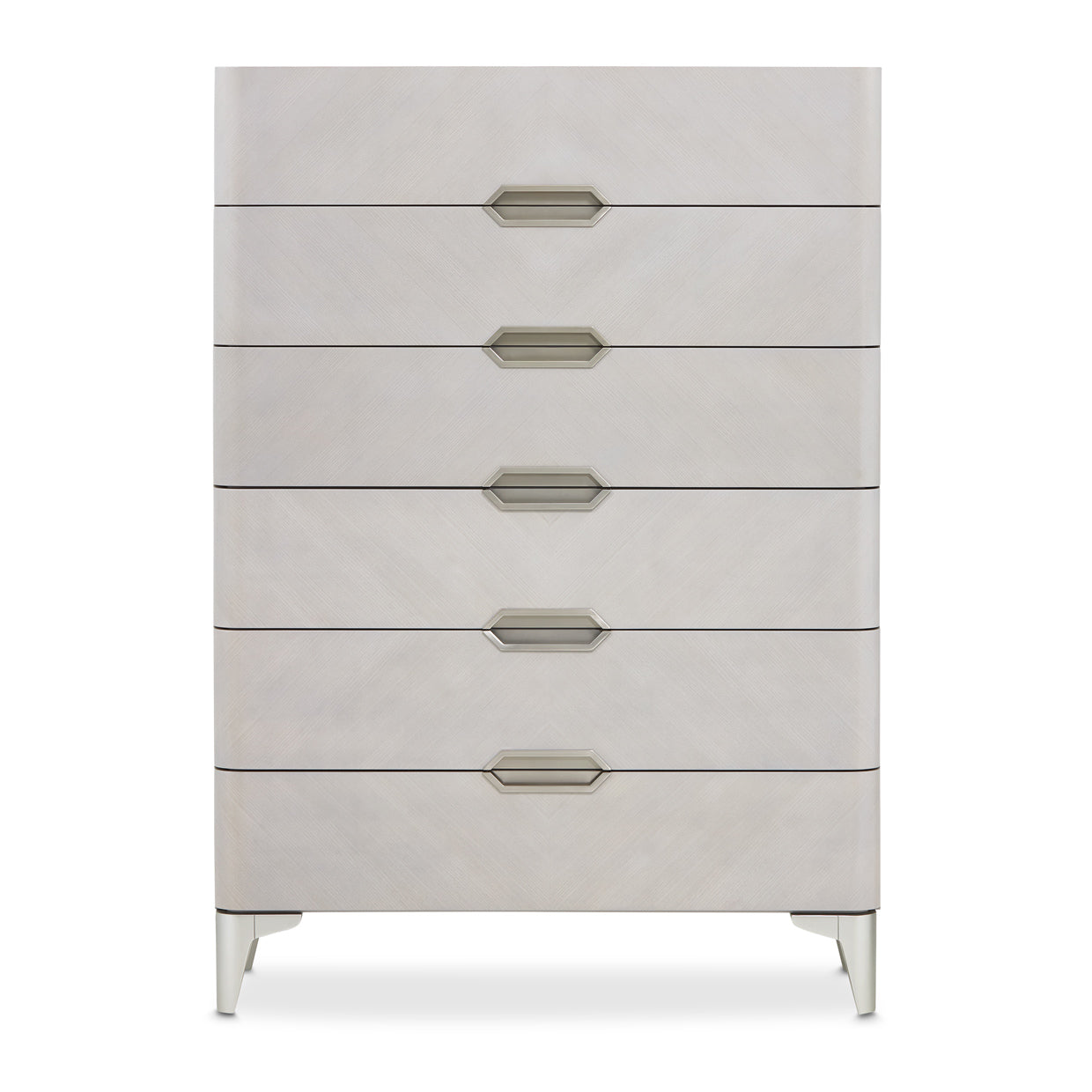 Enjoy flawless storage with The Penthouse Collection Chest. With stainless steel hardware, velvet lined drawers and a geometric veneer pattern, this design delivers a chic modern touch that's easy to love.