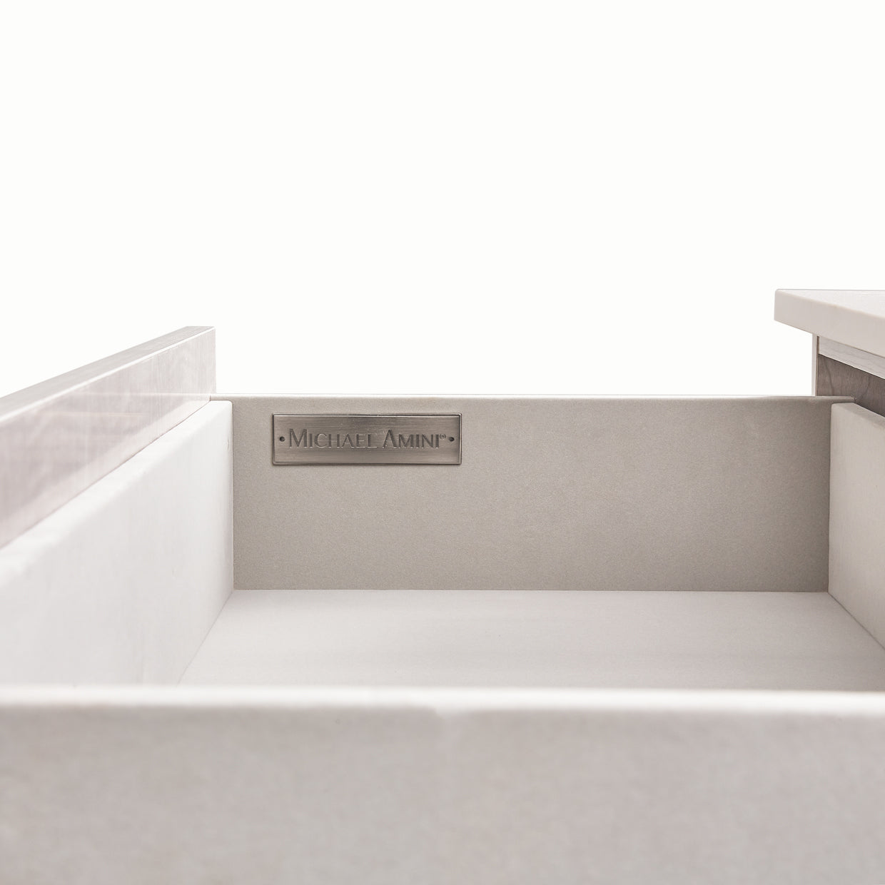 Keep your socks and sweaters safely tucked away with the Marin Chest, offering storage and style with 6 velvet lined drawers, a contrasting cultured marble top, stainless steel accents and stainless steel feet. Self-closing glides provide for extra smooth operation.