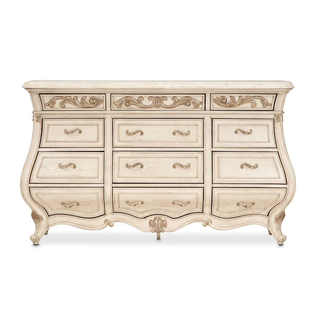 This magnificent 12-drawer dresser will help you avoid any storage problems with plenty of space for your clothing and belongings, while also bringing lavish style to any room at the same time. In addition to the velvet lined drawers, you’re also getting a cedar-lined drawer at the bottom, perfect for safely storing extra linens. This dresser handsomely demonstrates that you should never have to choose between style and practicality, the custom hardware and curved base provide the look that will make this piece an attractive, classic addition to any room it goes in.