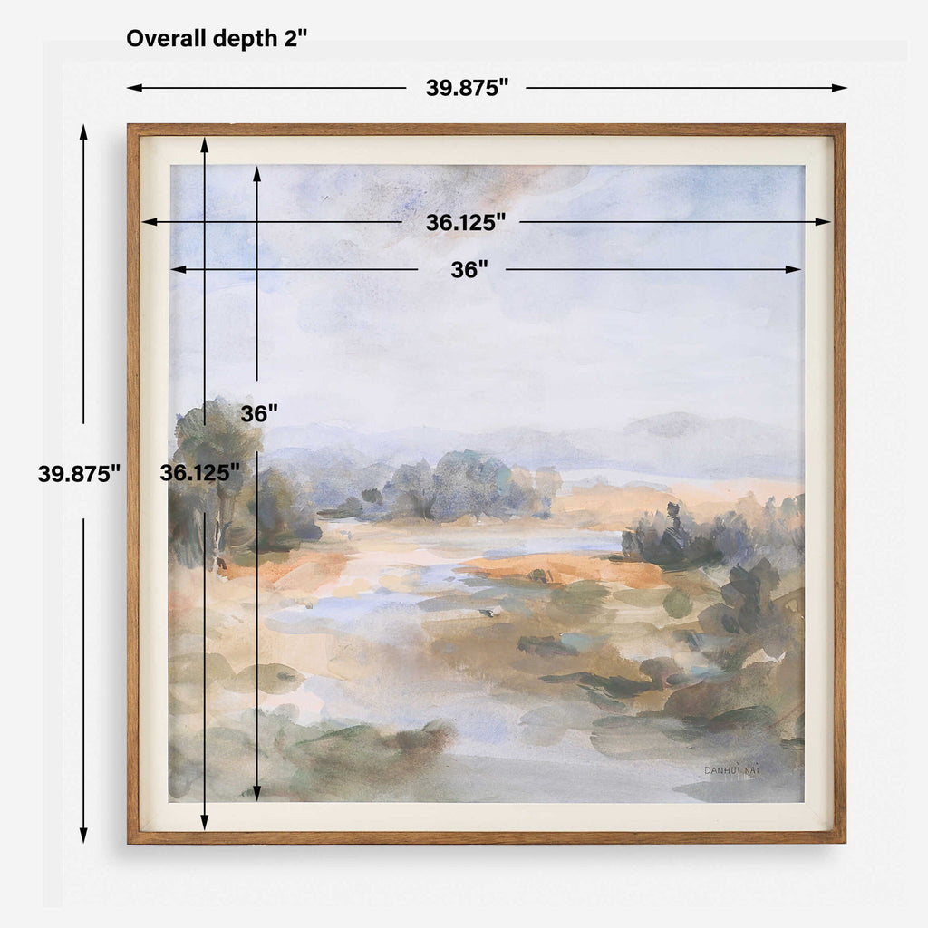 River Afternoon Framed Print Captures A Serene River Landscape In Shades Of Pastel Blue, Olive And Rust, Encased In A Warm Chestnut Frame Accented By An Off-white Linen Liner. Artwork By Danhui Nai.