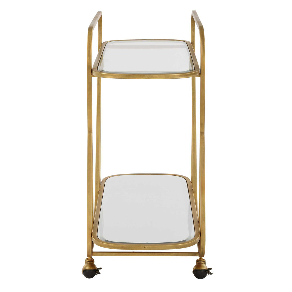 A Refined Serving Cart, Forged With A Beautiful Antique Brass Finish Made Completely From Iron. The Two Tray Style Beveled Mirrored Shelves Catch Natural Light Adding A Touch Of Sophistication To Any Room.