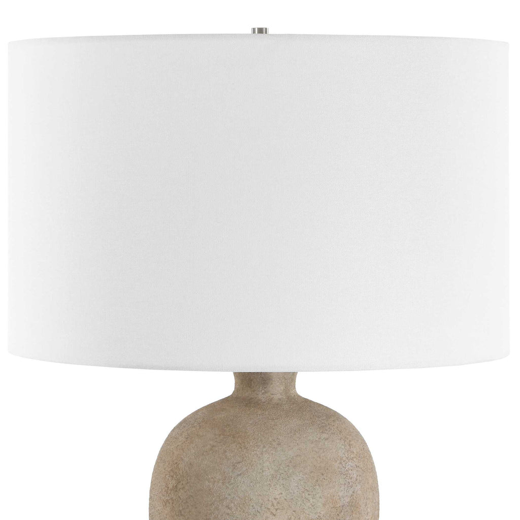 A Classic Silhouette Meets Organic Texture In This Stunning Ceramic Table Lamp. The Mottled Neutral Tones Accented By Brass Plated Accents Create A Versatile Piece That Complements Any Style. The Round Hardbacks Drum Shade Is Covered In A Casual White Linen Fabric.