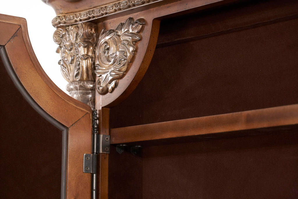 - Stunning marquetry, intricate botanical carvings and marble accents