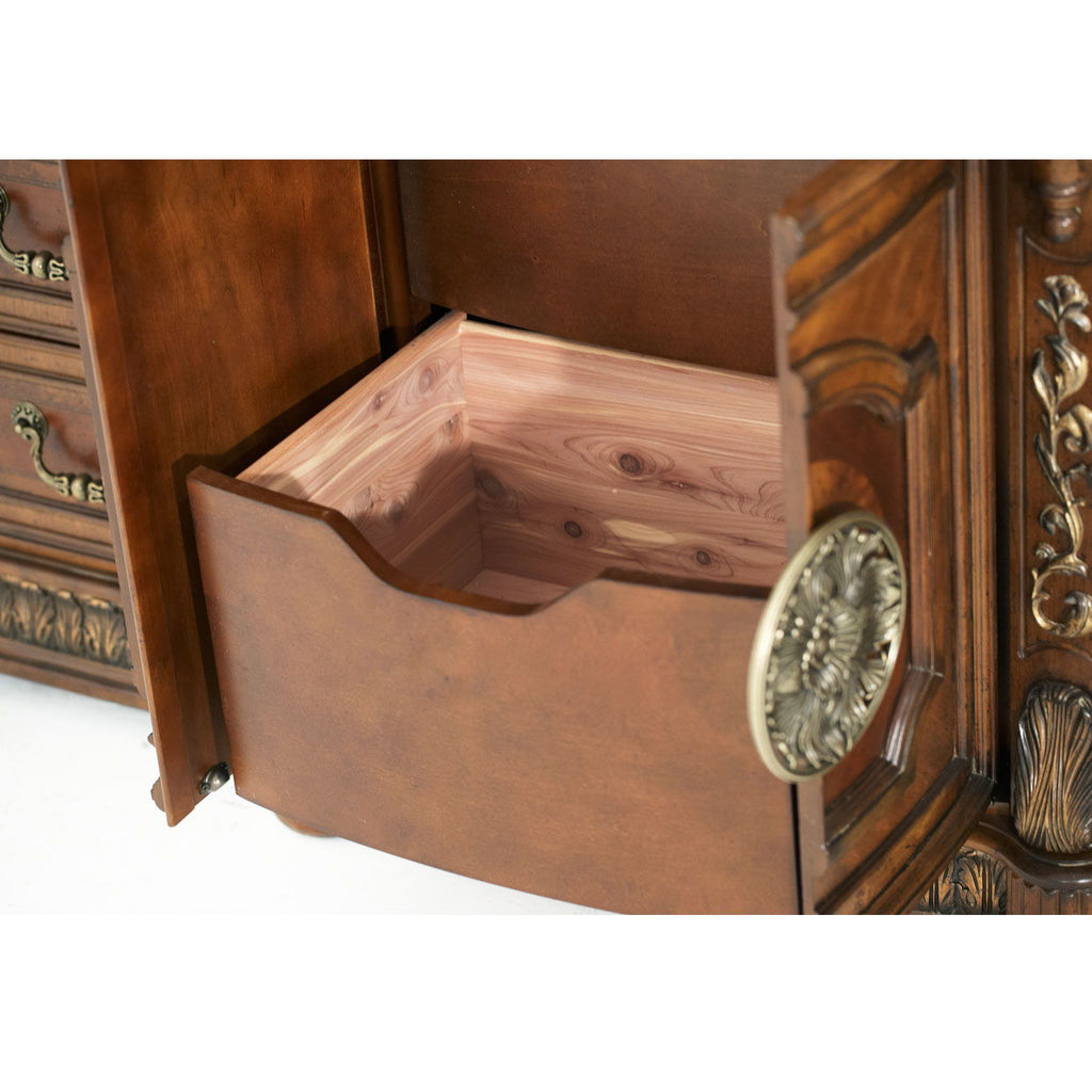 The striking and ornate style of the Villa Valencia Dresser and Mirror is bound to be admired. Elaborate carving and marble accents create a beautiful compliment to expertly crafted marquetry details. Along with its spectacular design, you will find that this traditional dresser also provides abundant storage. A combination of drawers and hidden storage ensure your items stay organized. In addition to the nine drawers that are seen, two more drawers are hidden behind the double-door center cabinet. The bottom drawer is cedar lined for freshness, and the top drawer is felt lined to protect your delicates. Matching mirror has display curios with lighting at each side, enhancing the overall look.