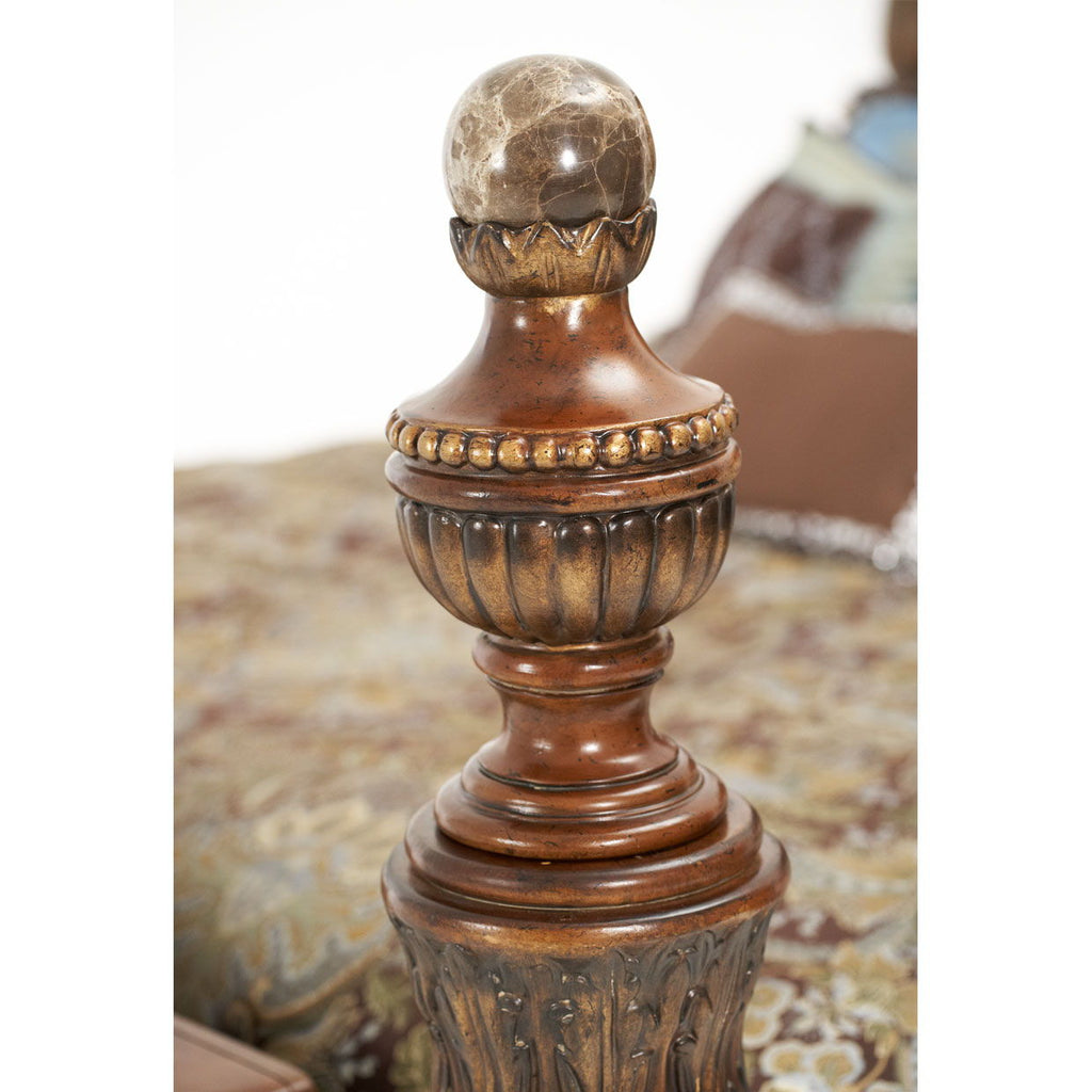 With magnificent posts, the Villa Valencia Poster Bed will be a breathtaking addition to your traditional bedroom décor. This poster bed is constructed by skilled craftsmen and artisans who have utilized birch solids and pecan veneer overlays and elm burl accents. The bed sports a classic finish while the headboard and footboard and side rails feature a lovely paneled detailing, carved floral motifs and carved accents.
