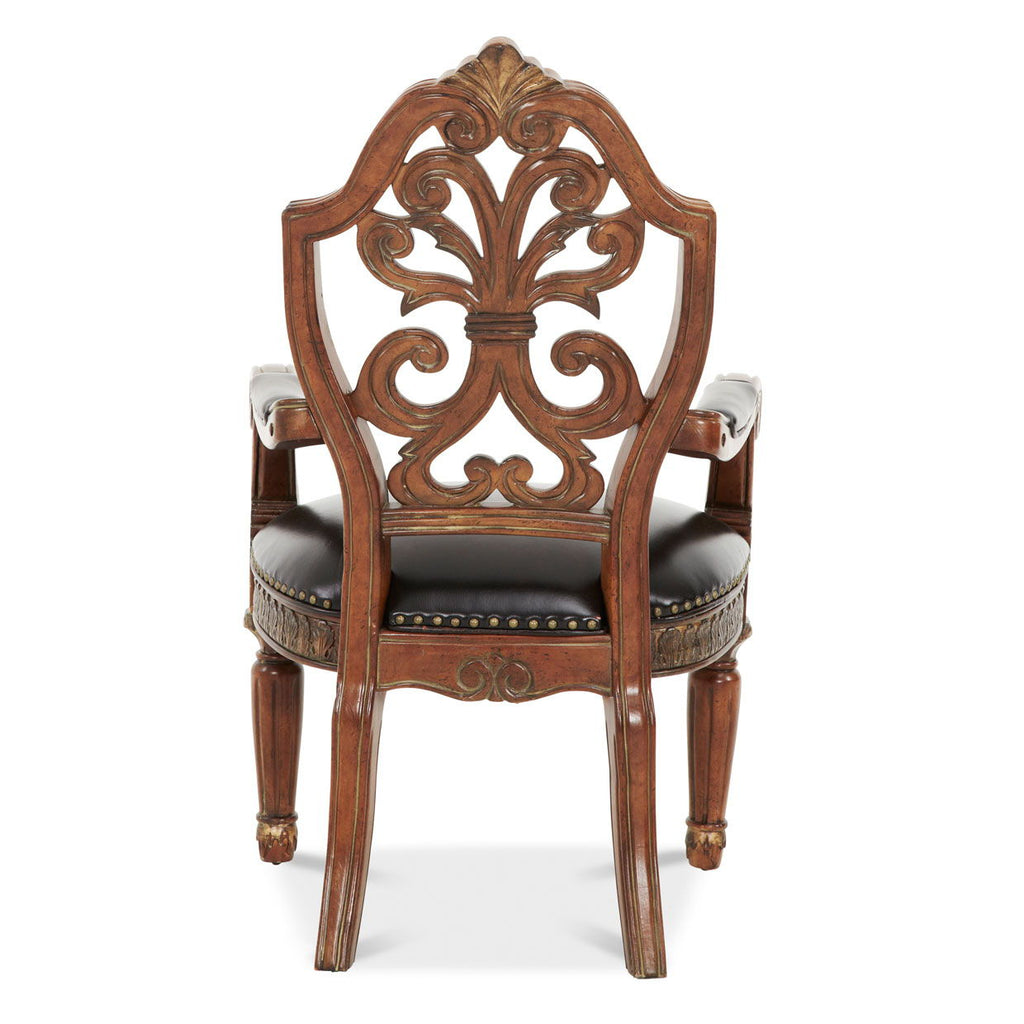 Provide luxurious seating for your dinner guests by adding the Villa Valencia Armchair(s) to your dining room décor. These chairs are constructed from Birch solids with pecan, cherry, and elm burl veneers. With a traditional style and a classic chestnut finish, these side chairs have a hint of exotic Moorish elegance. The leather seat provides plush comfort and is accented by a nail head trim arrangement. The backrest of the chair has fabric upholstery with a lovely floral embroidery design. The chair frame has intricate botanical carvings and gorgeous decorative finials and the arms of the chair are adorned with decorative leather pieces to further the luxurious feel of the chair.