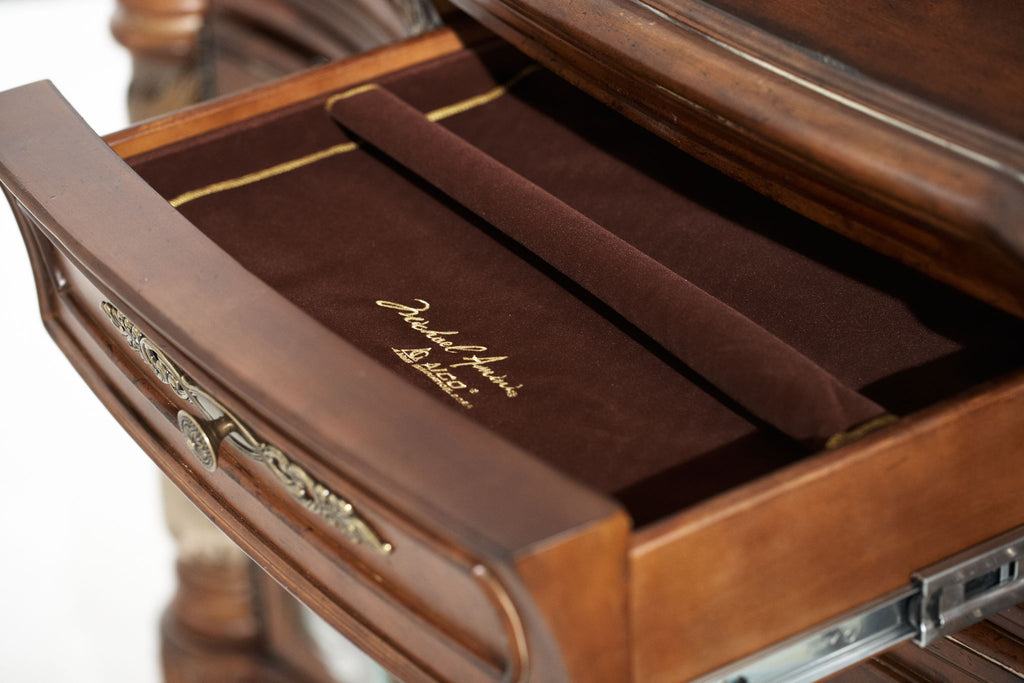 The Villa Valencia Sideboard is designed in a traditional style and features a classic finish that imparts an old-world Spanish feel to the dining décor. This unique design will add a touch of class and sophistication to the dining room. Ornate details such as marble pilasters with carved leaf accents, botanical motifs on the base and trim and antique brass hardware provide a lavish and luxurious aura to the sideboard. The sideboard has three storage drawers, two glass door cabinets, and a two-door wooden cabinet.